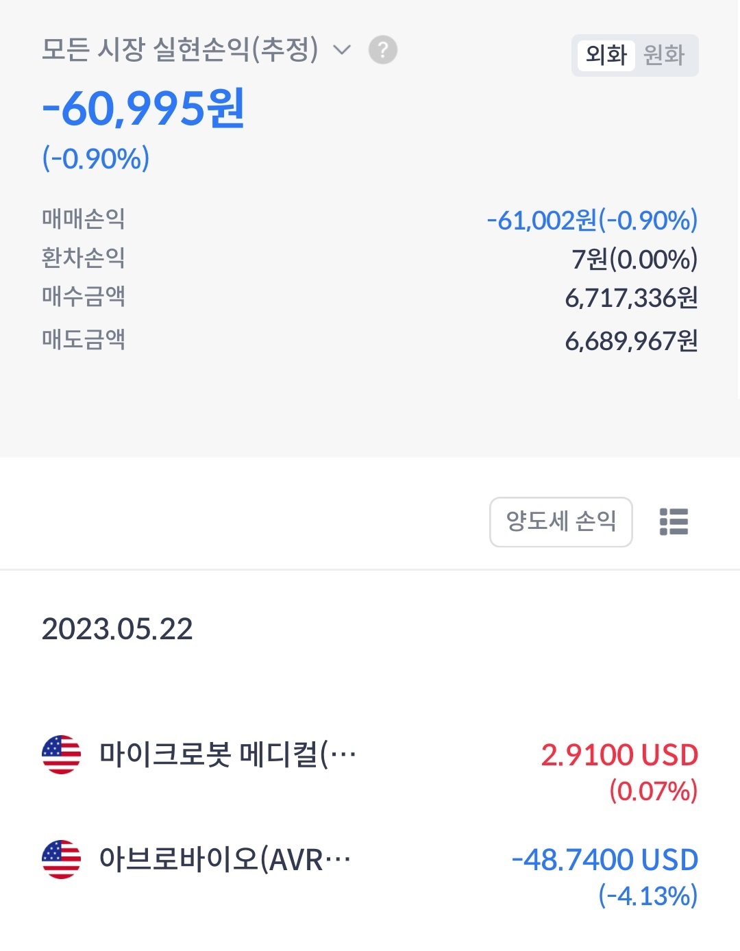 위 사진을 보시면 아시겠지만, 이번 미국주식 단타매매를 통해 발생한 매매 수수료는 총 33,626원입니다. 분명히 매수 매도 차익은 마이너스 27,369원이었는데, 여기에다 수수료를 더하니 모든 시장 실현손익이 마이너스 60,995원이 됐습니다.
