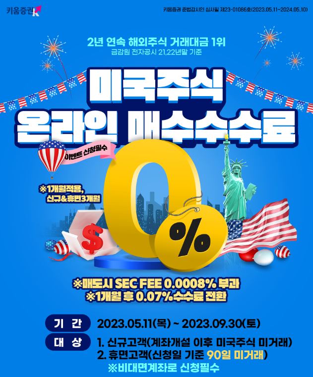 대상은 신규고객과 휴면고객이며, 비대면계좌로 미국주식계좌를 만들시 일정 기간동안 미국주식 매수수수료가 무료이고 그 기간이 지나면 매매 수수료 0.07%가 부과된다고 합니다.