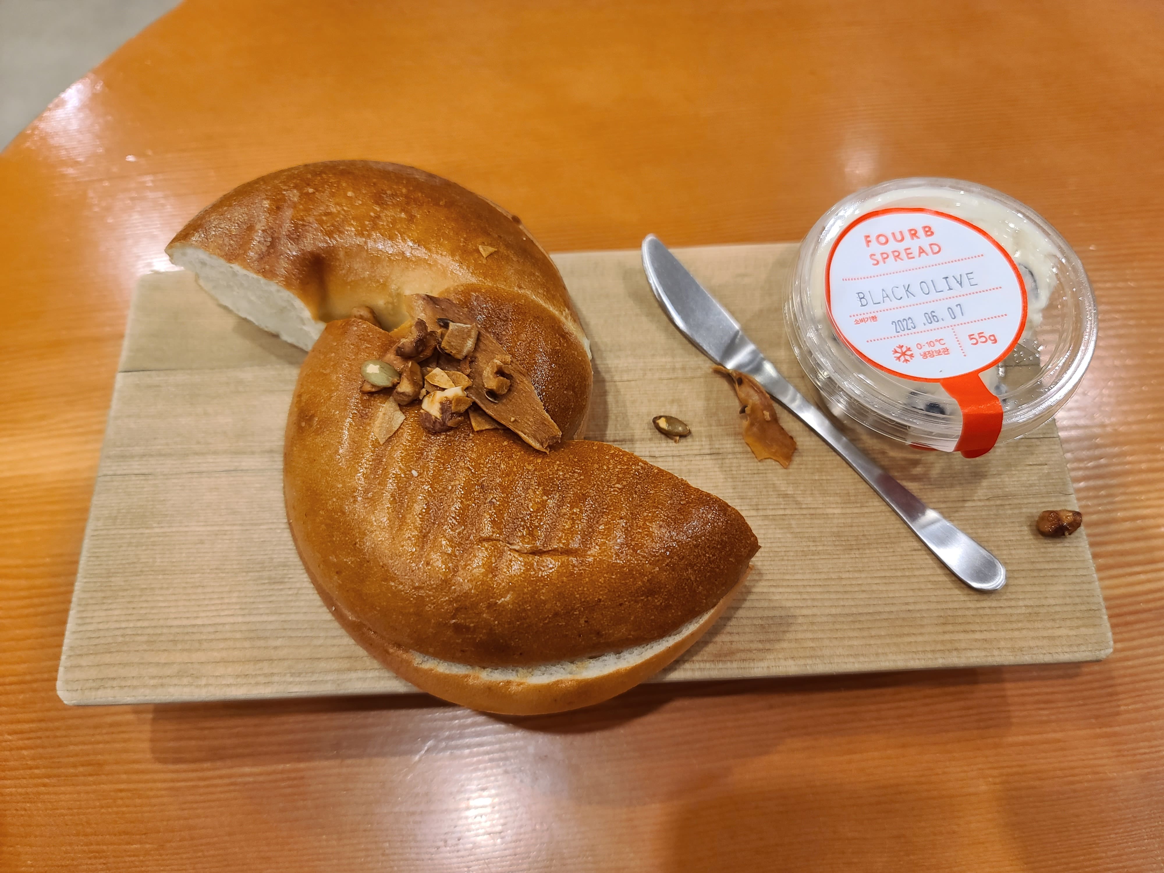 저는 플레인 베이글과 블랙올리브 크림치즈를 주문했습니다.