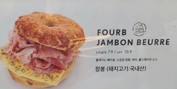 가장 먼저 홀스래디쉬 소스, 소금칩 잠봉, 버터, 볼케이노 베이글이 들어간 포비 잠봉뵈르 샌드위치가 있습니다.