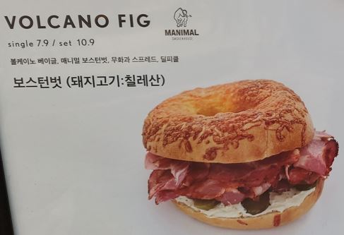 두 번째로는 딜피클, 매니멀 보스턴벗, 무화가 스프레드, 볼케이노 베이글이 들어간 볼케이노 피그 샌드위치가 있습니다.