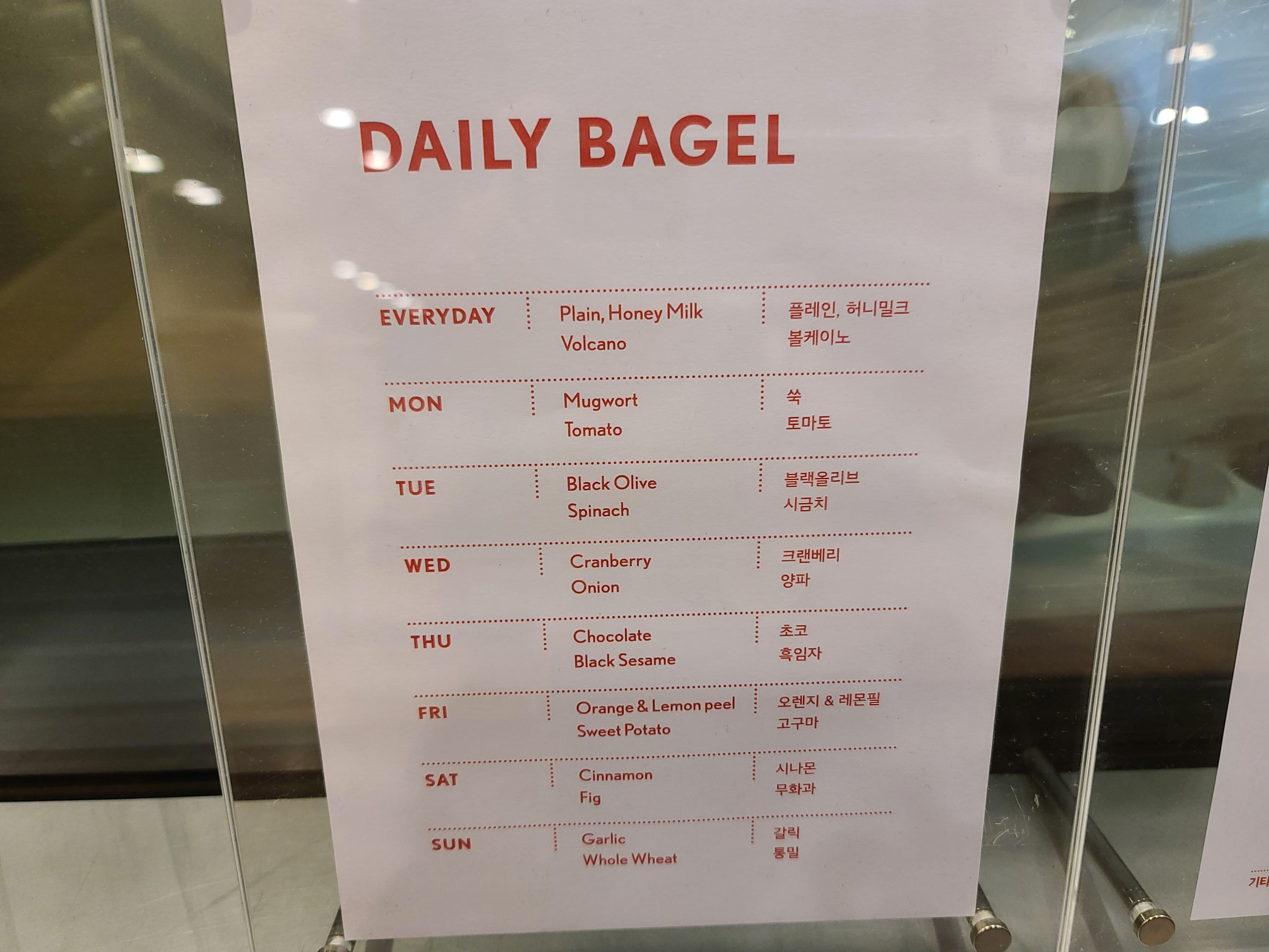 아, 다시 보니 이런식으로 입구의 오늘의 베이글과 크림치즈, 커피 메뉴가 적혀있었네요.