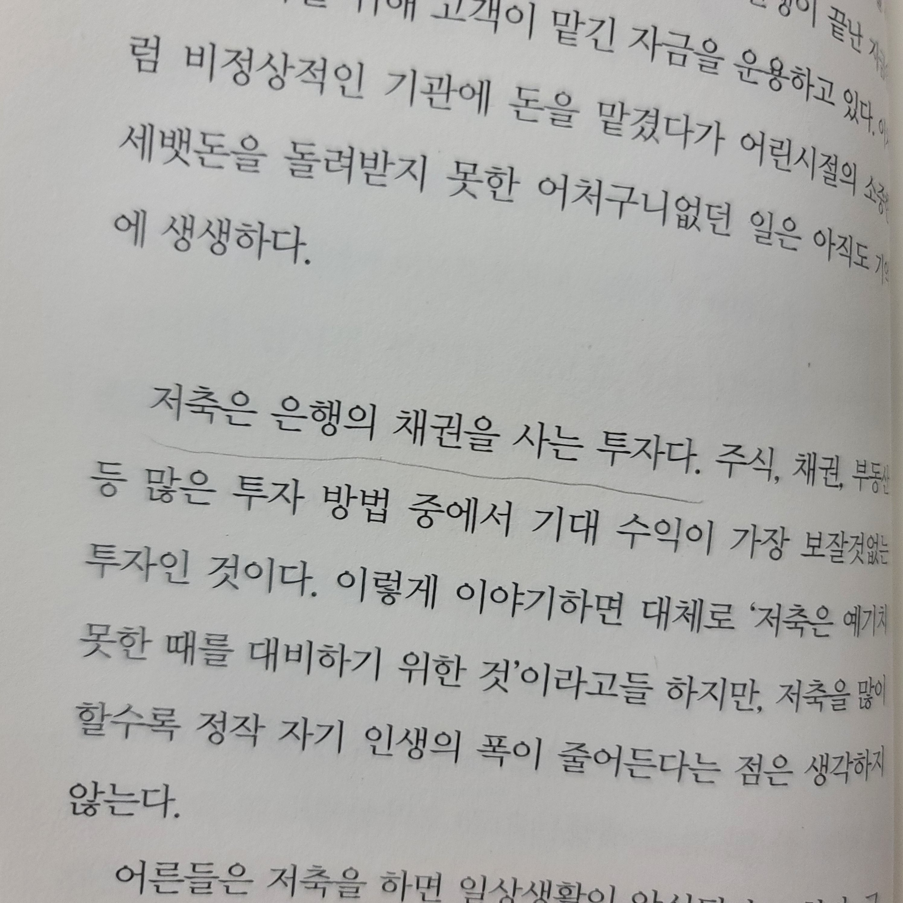 저축이 무조건적인 미덕이고 한푼이라도 아껴서 적금을 들고 예금을 들어야 한다는 말을 귀에 피가 나도록 들은 내가 이 문장을 처음 봤을 때, 정말 10초간 가만히 멍때리면서 이 문장을 가만히 바라보게 됐다.