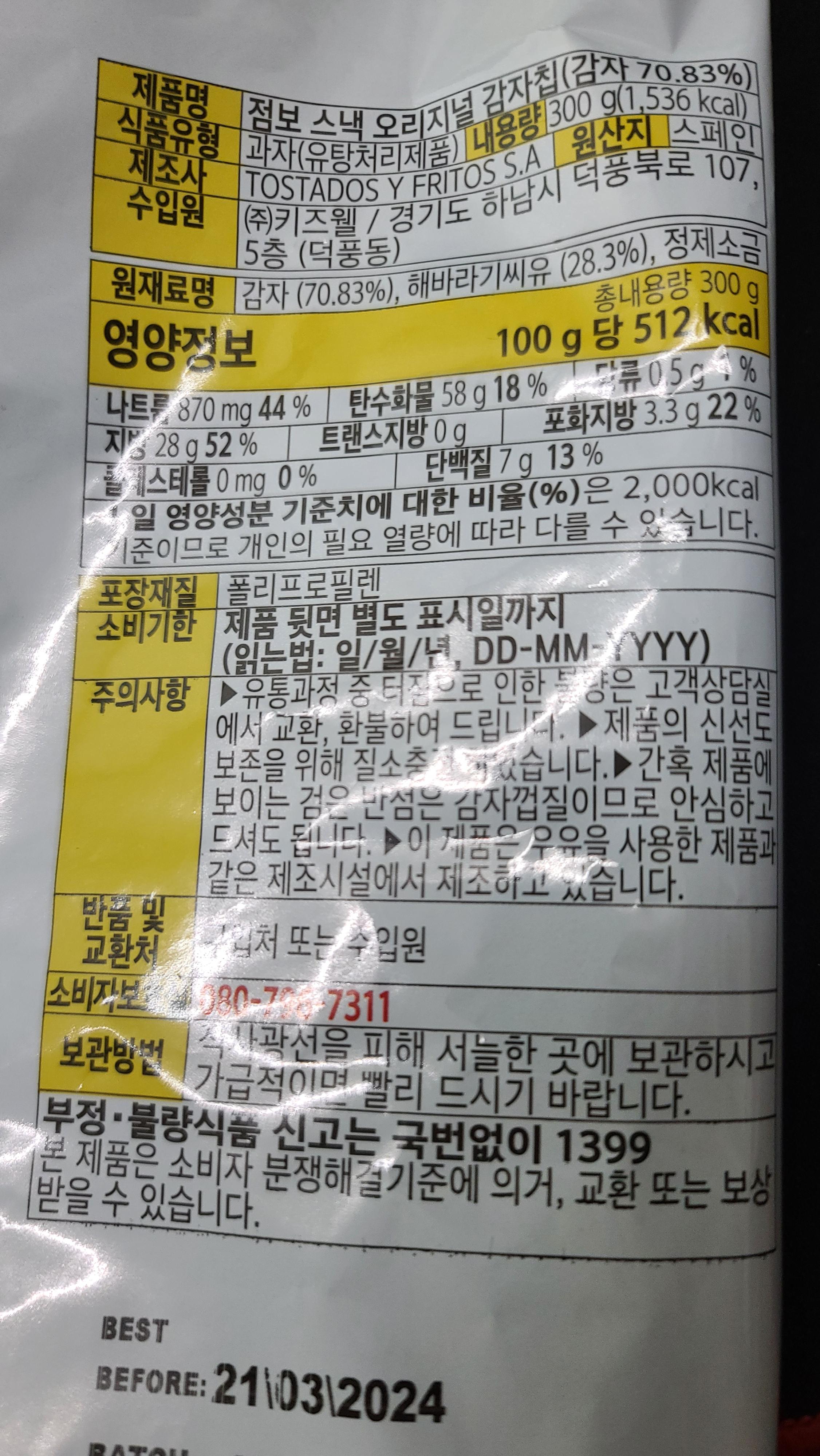참고로 이 노브랜드 오리지널 점보 감자칩은 Tostados Y Fritos S.A 라는 스페인 과자 기업에서 만든 감자칩입니다.