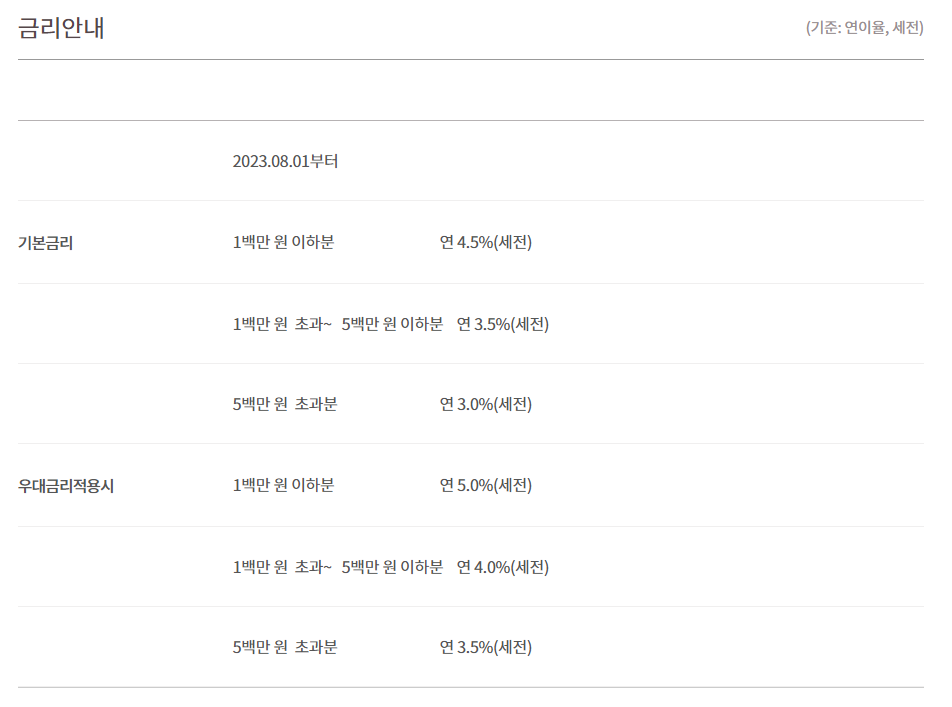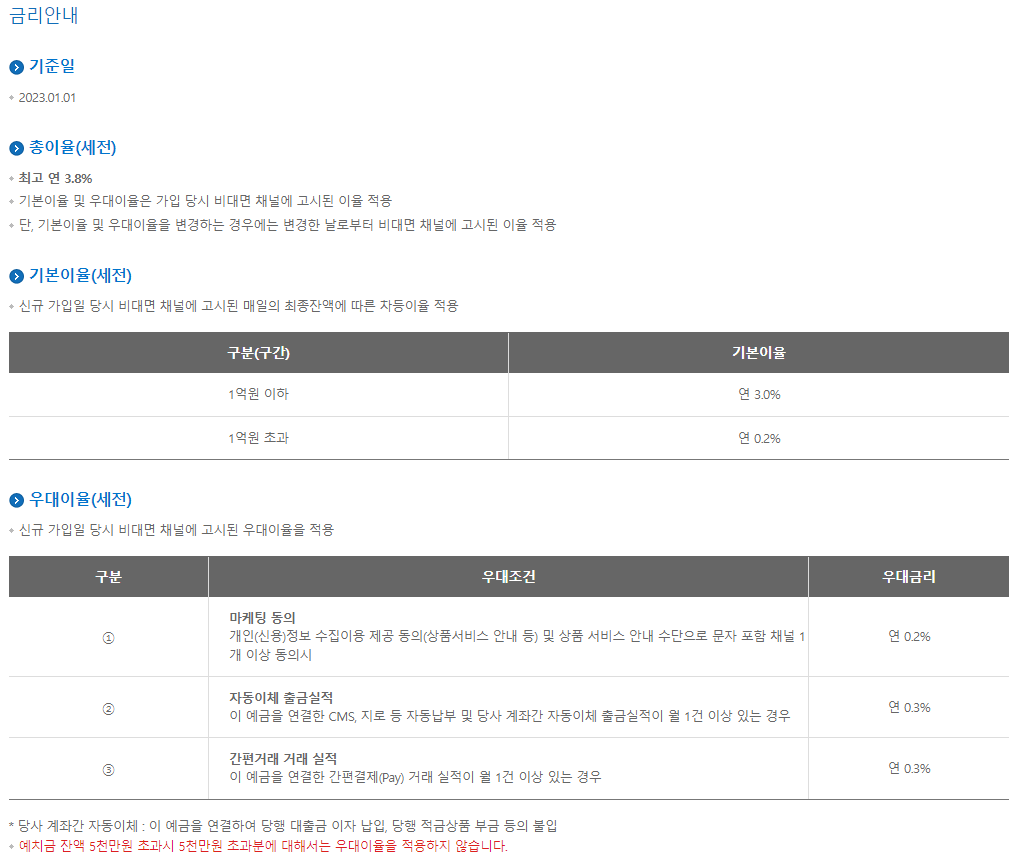 그리고 입금된 예치금 잔액이 5천만 원을 넘어가면, 그 넘어간 초과분에 대해서는 우대 이율이 적용되지 않는다고 하니 참고하시기 바랍니다.