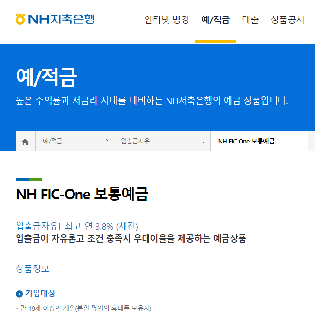 NH 저축은행의 파킹통장인 NH FIC-One 보통예금의 금리는 최고 연 3.8%라고 나와있네요.