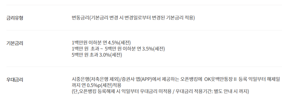우대금리 조건은 시중은행 및 증권사 오픈뱅킹에 OK읏백만통장 2를 등록하면 되는 것입니다.