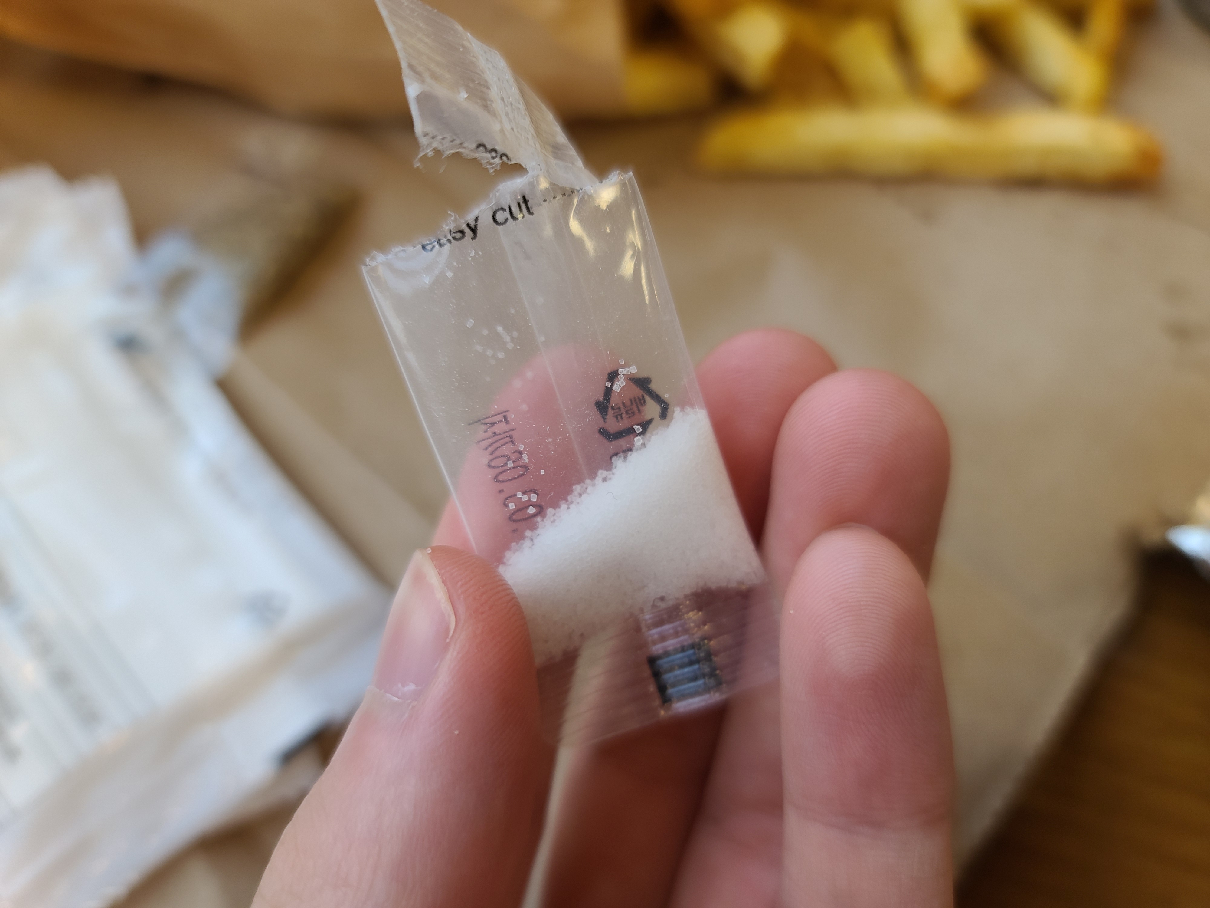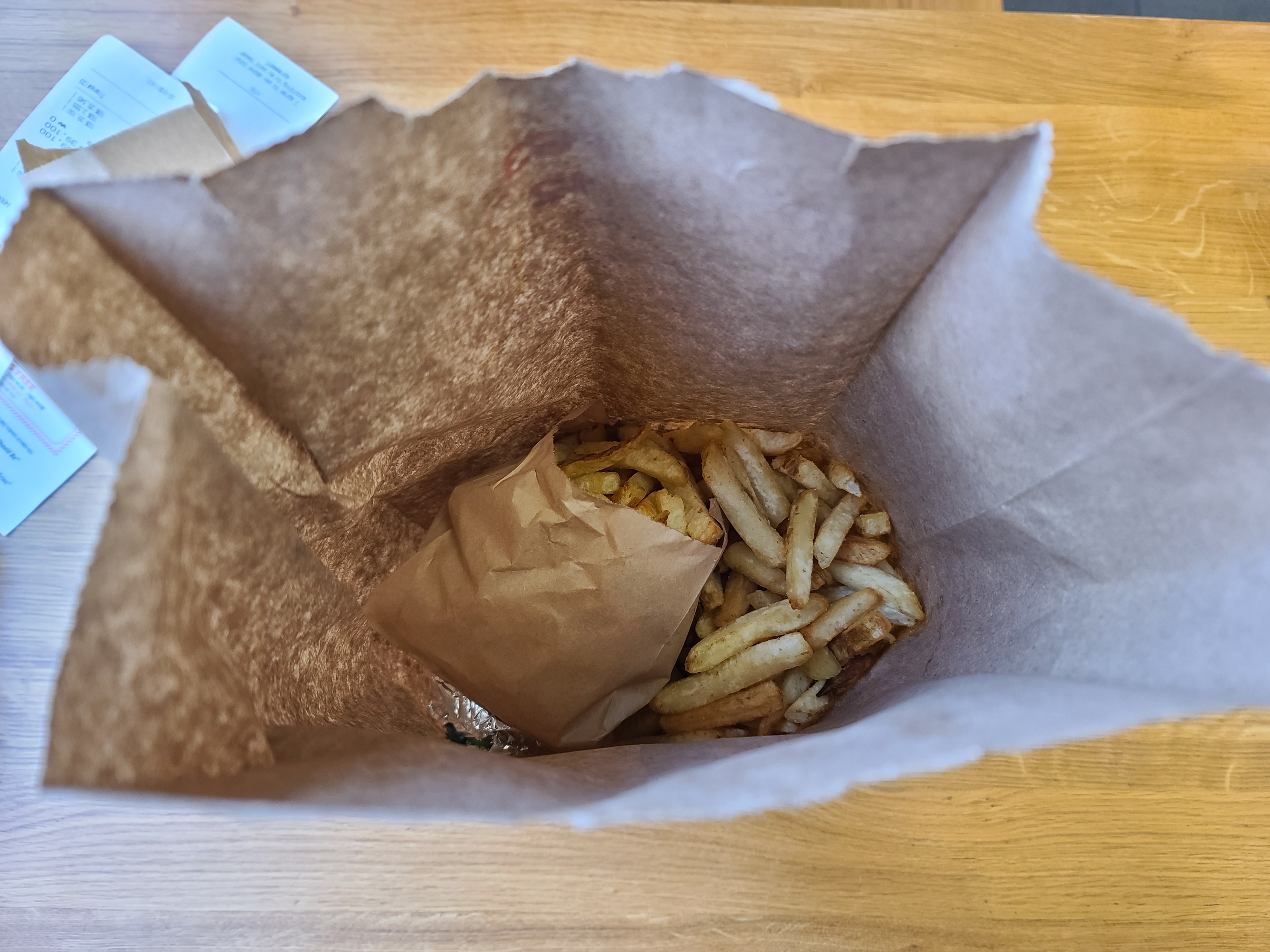 그리고 레귤러 사이즈 이상의 감자튀김을 시키면 이렇게 감자튀김이 작은 봉투 밖으로 삐져나오게끔 감자튀김을 그냥 막 담아줍니다.