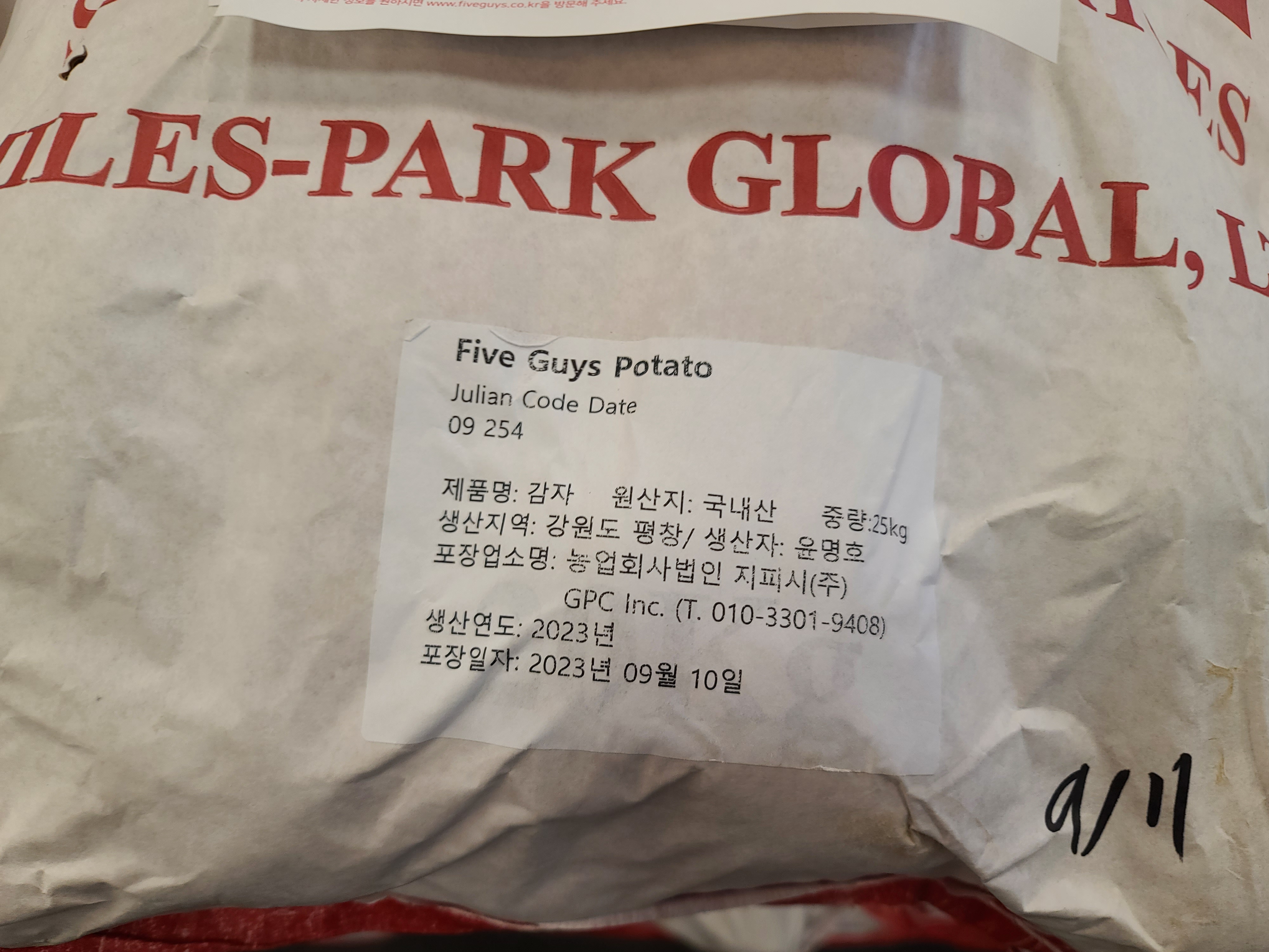 원산지는 평창입니다. 강원도 평창에서 직접 캐낸 감자를 감자튀김용으로 사용하는 것 같았습니다. 제가 9월 12일에 파이브가이즈 강남에 방문했는데, 포장일자가 놀랍게도 9월 10일이군요. 진짜 이따 밑에서도 말씀드리겠지만, 감자가 그냥 미쳤습니다. 햄버거집이 아니라 감자튀김 집이라고 해도 될 정도로 정신 나가는 맛인데 지금 말씀드리면 재미 없으니 이따 포스팅 하단에서 다시 말씀드리도록 하겠습니다.