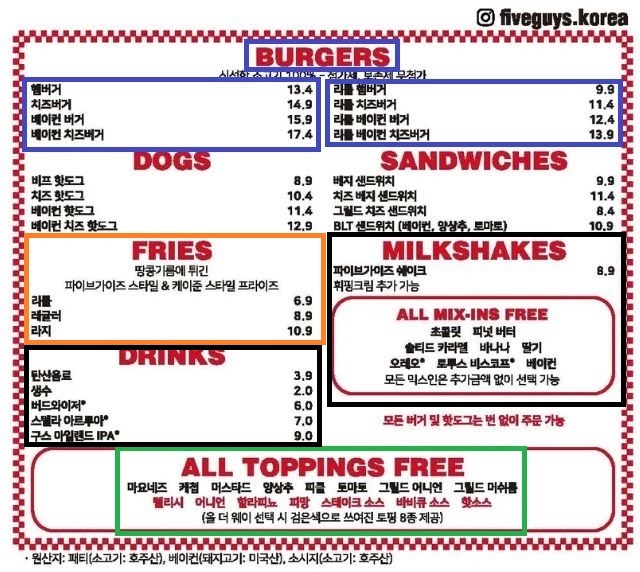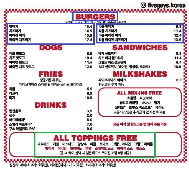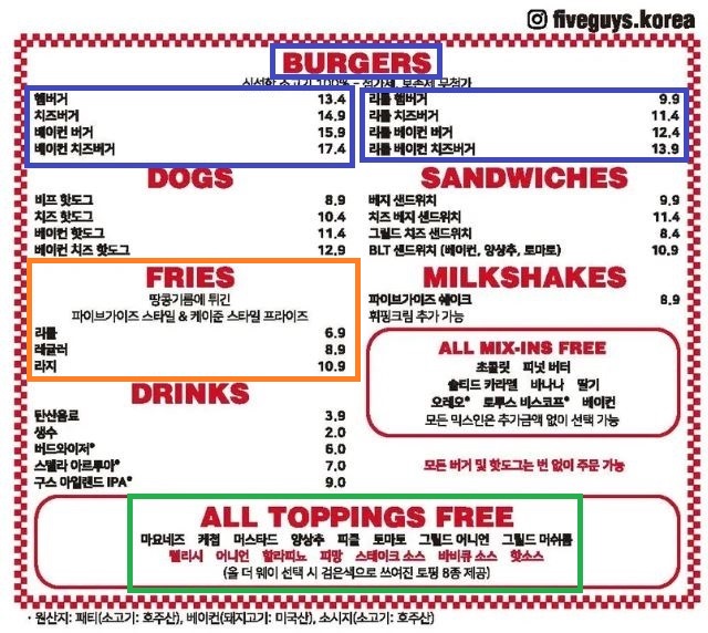 제가 강남 파이브가이즈에서 직접 촬영한 메뉴판인데 글씨가 작아서 잘 보이지 않군요. 다른 메뉴판을 보면서 설명드려보도록 하겠습니다.