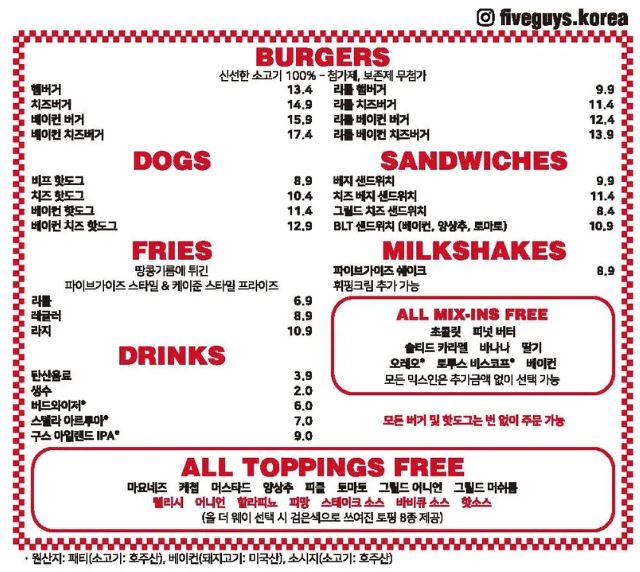 파이브가이즈에 입장을 하시면, 아마 위와 같은 종이 메뉴판을 직원분들이 나눠주실겁니다. 줄을 설때 이걸 보면서 무엇을 먹을지 천천히 생각해주시면 됩니다.