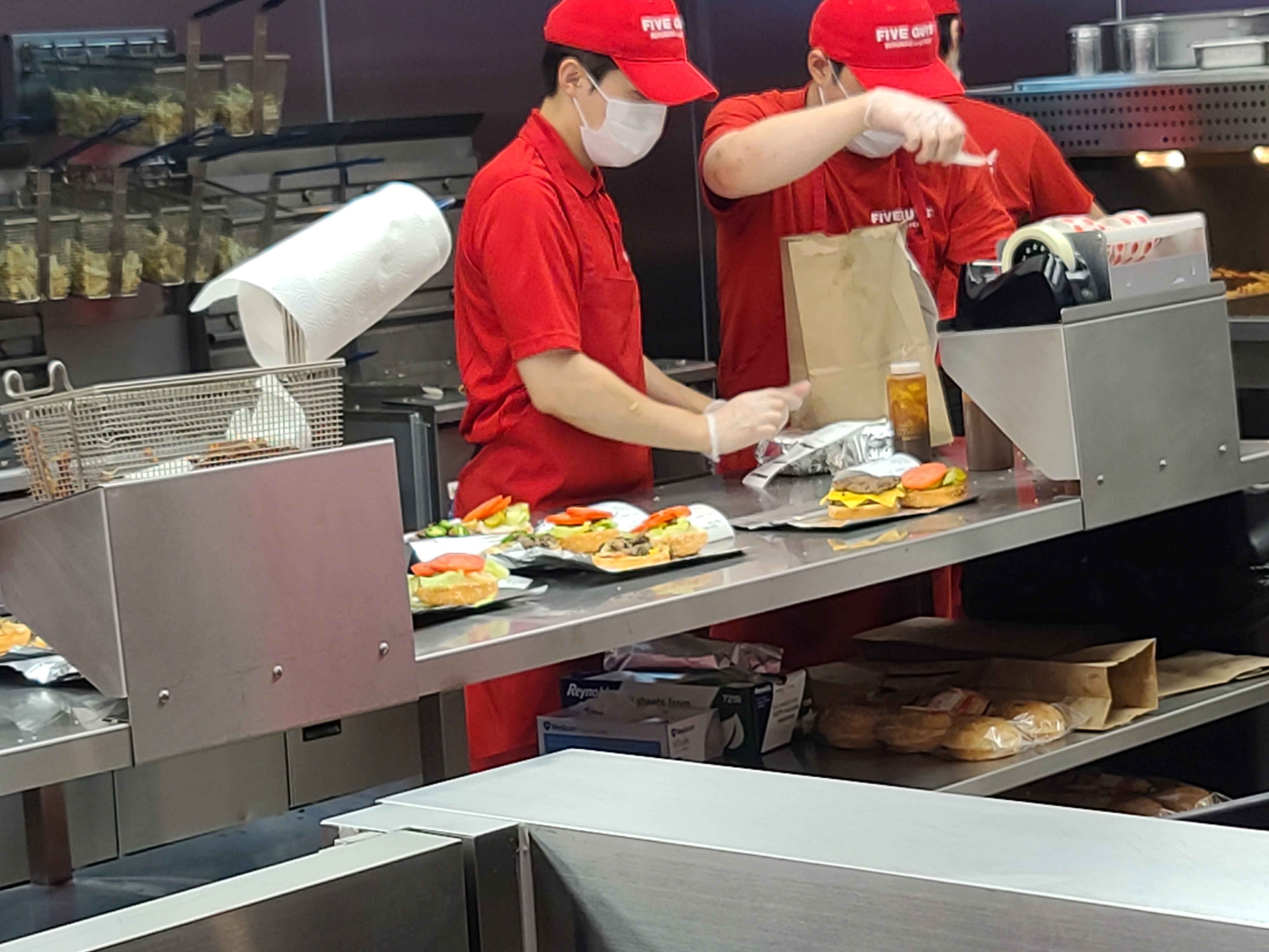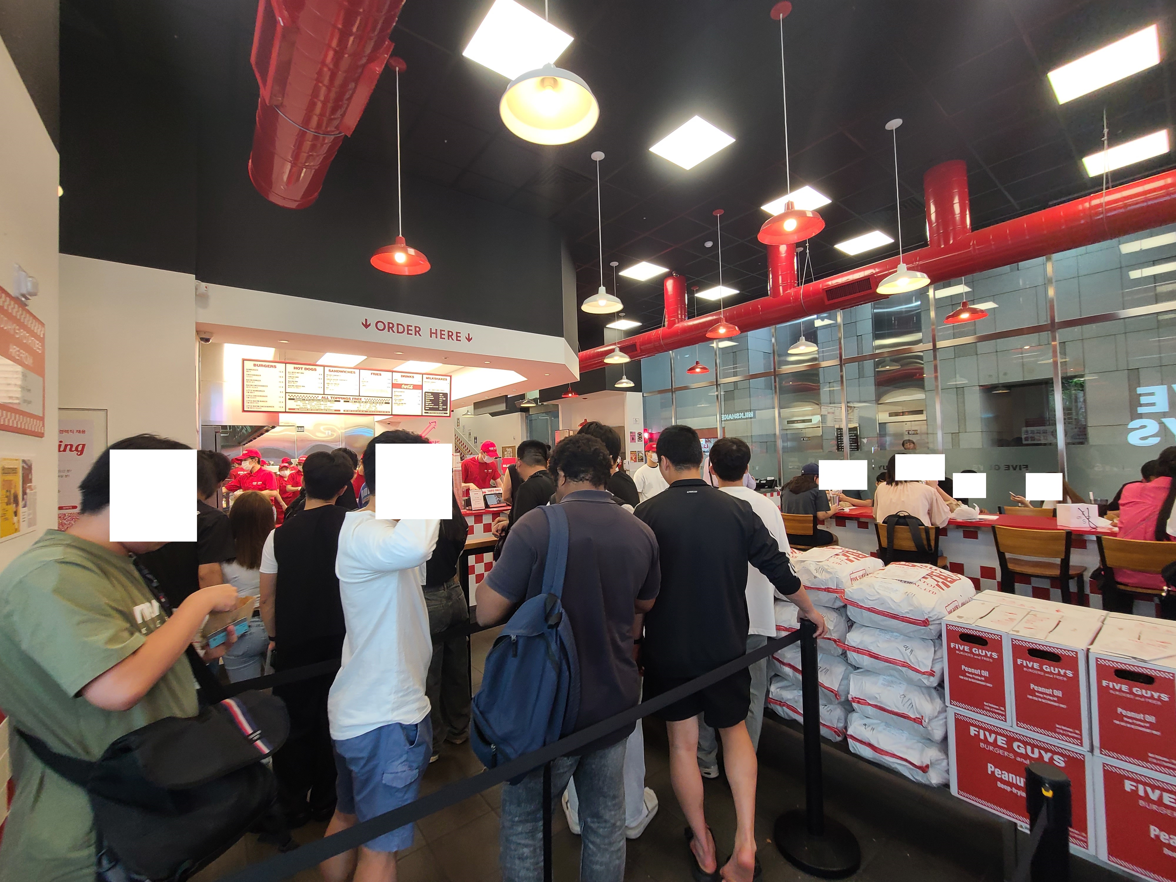 이렇게 파이브가이즈 매장 앞에 줄서는 곳이 짧게 마련되어 있었는데, 위 사진처럼 앞에 10명 정도가 기다리고 있었고 5분 정도 기다리니 매장 안쪽으로 들어갈 수 있었습니다.