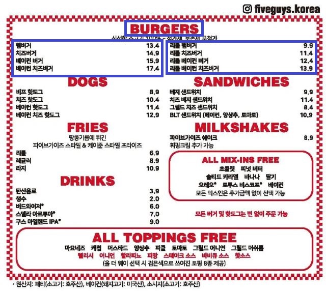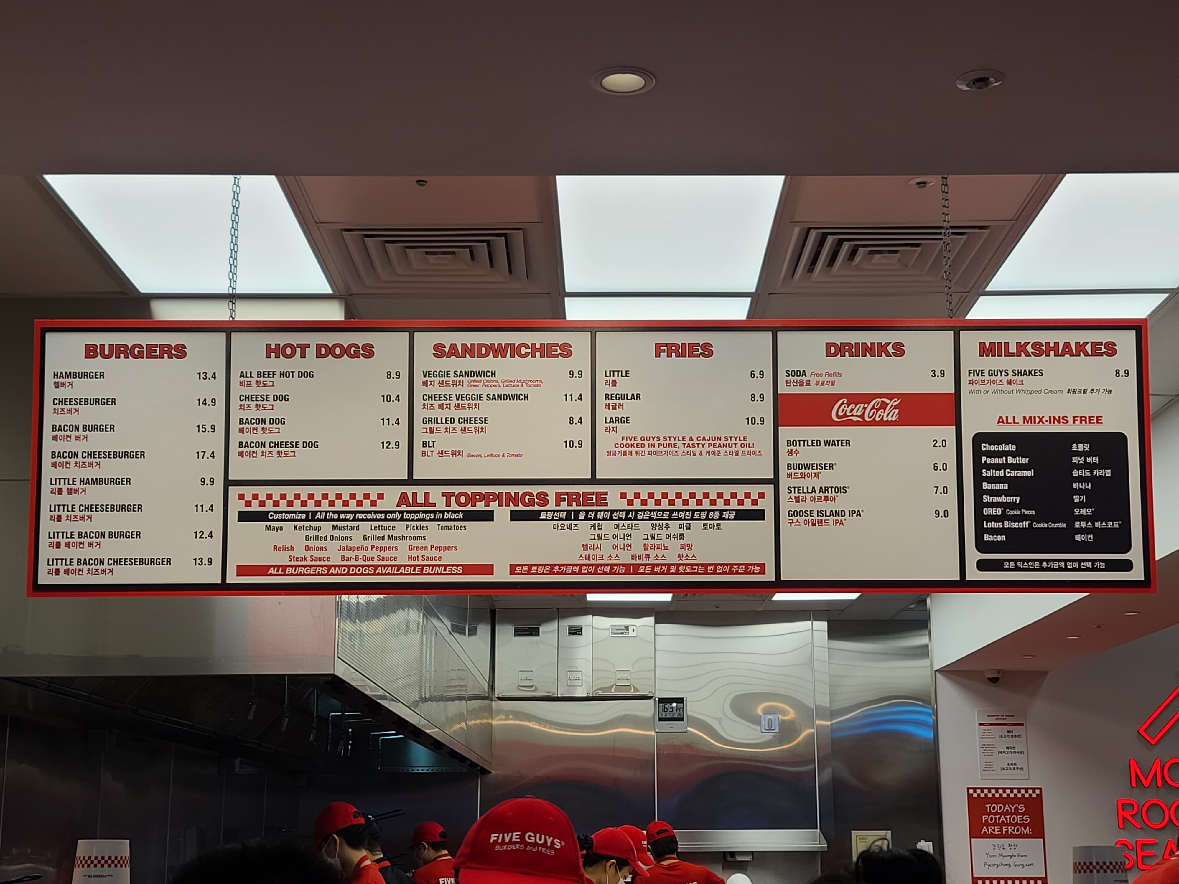 파이브가이즈 강남에 처음 방문하신 분들이라면, 이곳에 어떤 메뉴가 있는지 매우 궁금하실 거라고 생각합니다. 천천히 메뉴판을 보면서 설명드려보도록 하겠습니다.