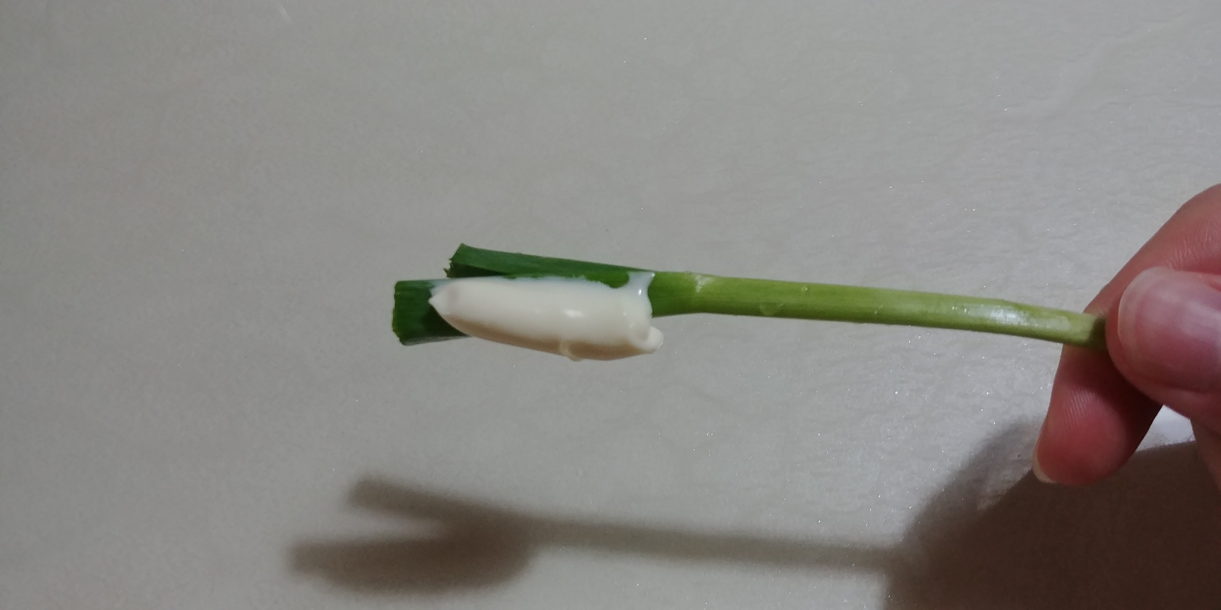 원래는 마요네즈를 참치와 함께 먹는 것을 좋아하는데 이 리뷰를 하려고 참치캔 하나를 새로 따자니 매우 아까웠습니다. 따라서 마요네즈를 찍어먹을 무언가를 찾다가 아일랜드 식탁 근처에 놓여있는 마늘잎을 발견했습니다. 처음에는 대파인 줄 알았는데 아버지가 마늘잎이라고 해서 놀랐습니다.