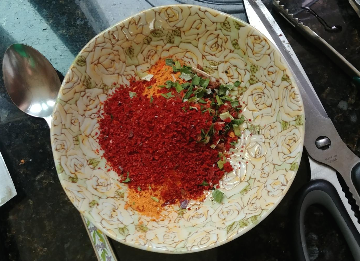 4. 파기름에 라면 스프 및 야채 스프와 고춧가루 두 스푼을 넣어줍니다.