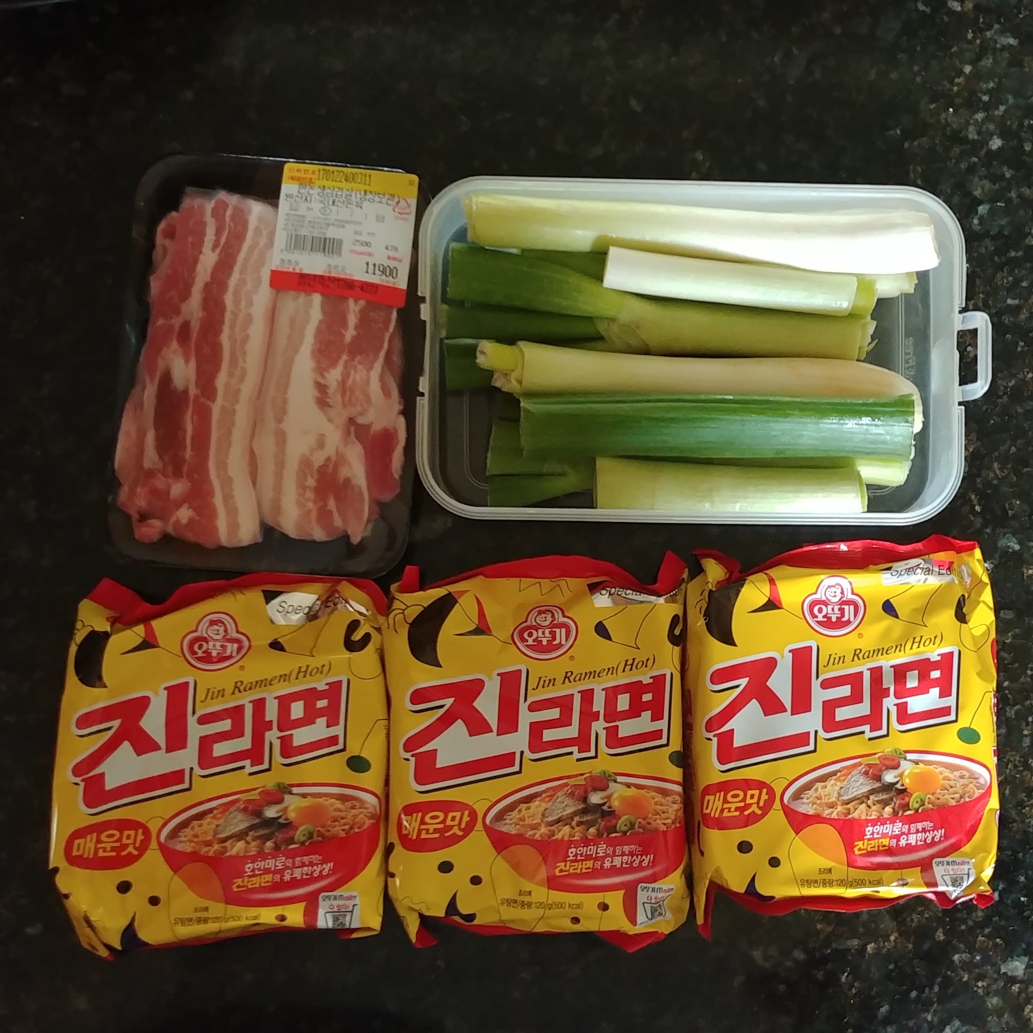 재료는 위의 사진과 같습니다. 오늘의 핵심인 진라면 매운맛, 삼겹살, 그리고 대파입니다. 저는 여기에 다진마늘과 청양고추를 조금 추가했지만, 굳이 없어도 됩니다. 그러면 이제부터 요리를 해가면서 하나씩 리뷰를 해보도록 하겠습니다.