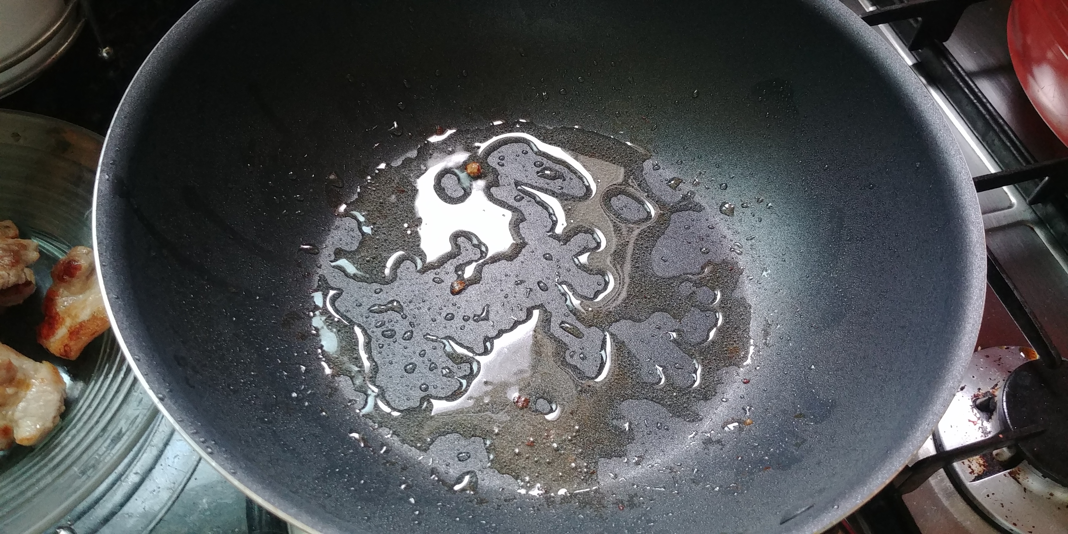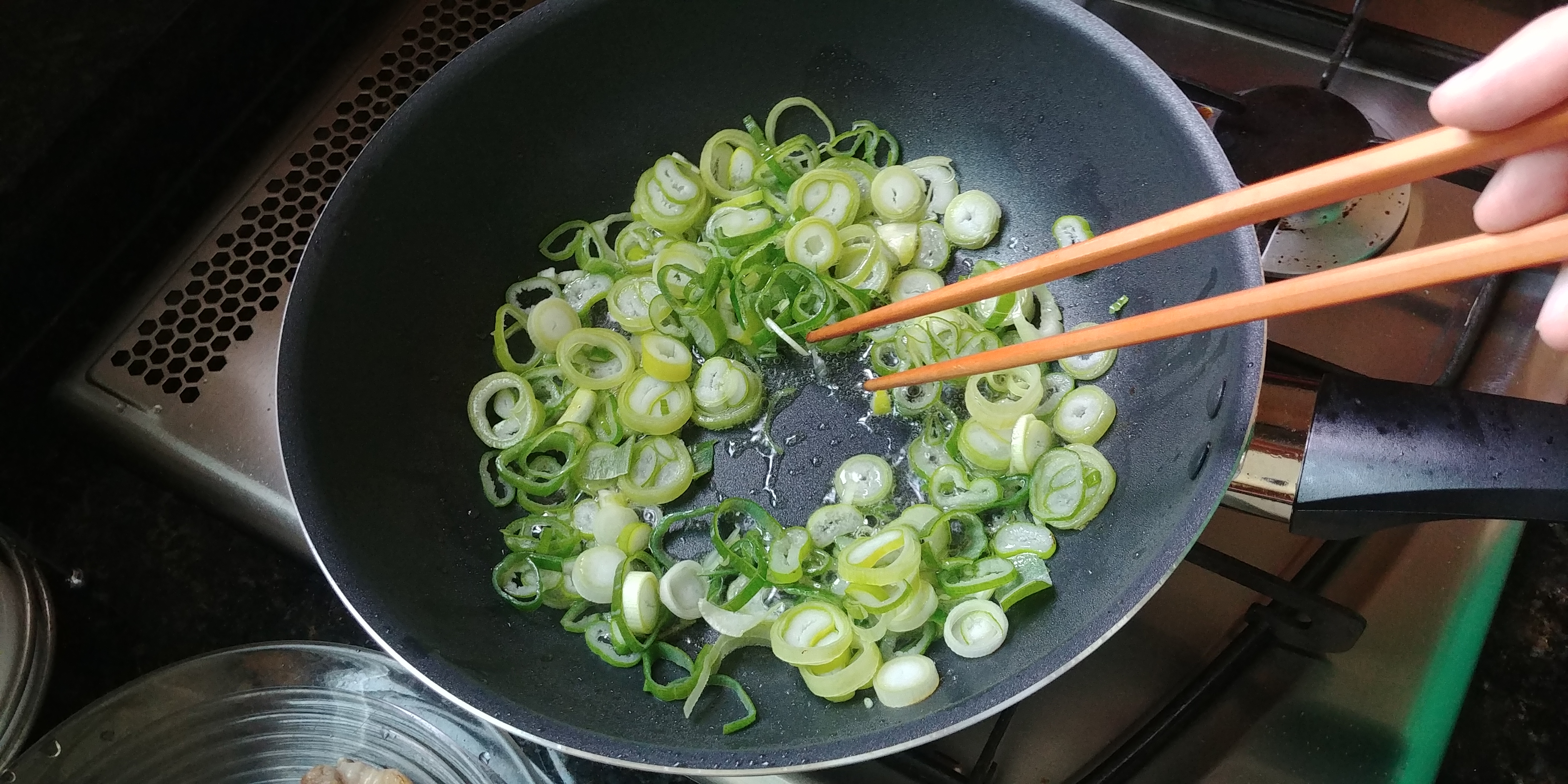 3. 돼지고기 기름에 식용류를 첨가하여 파를 넣고 파기름을 내줍니다.