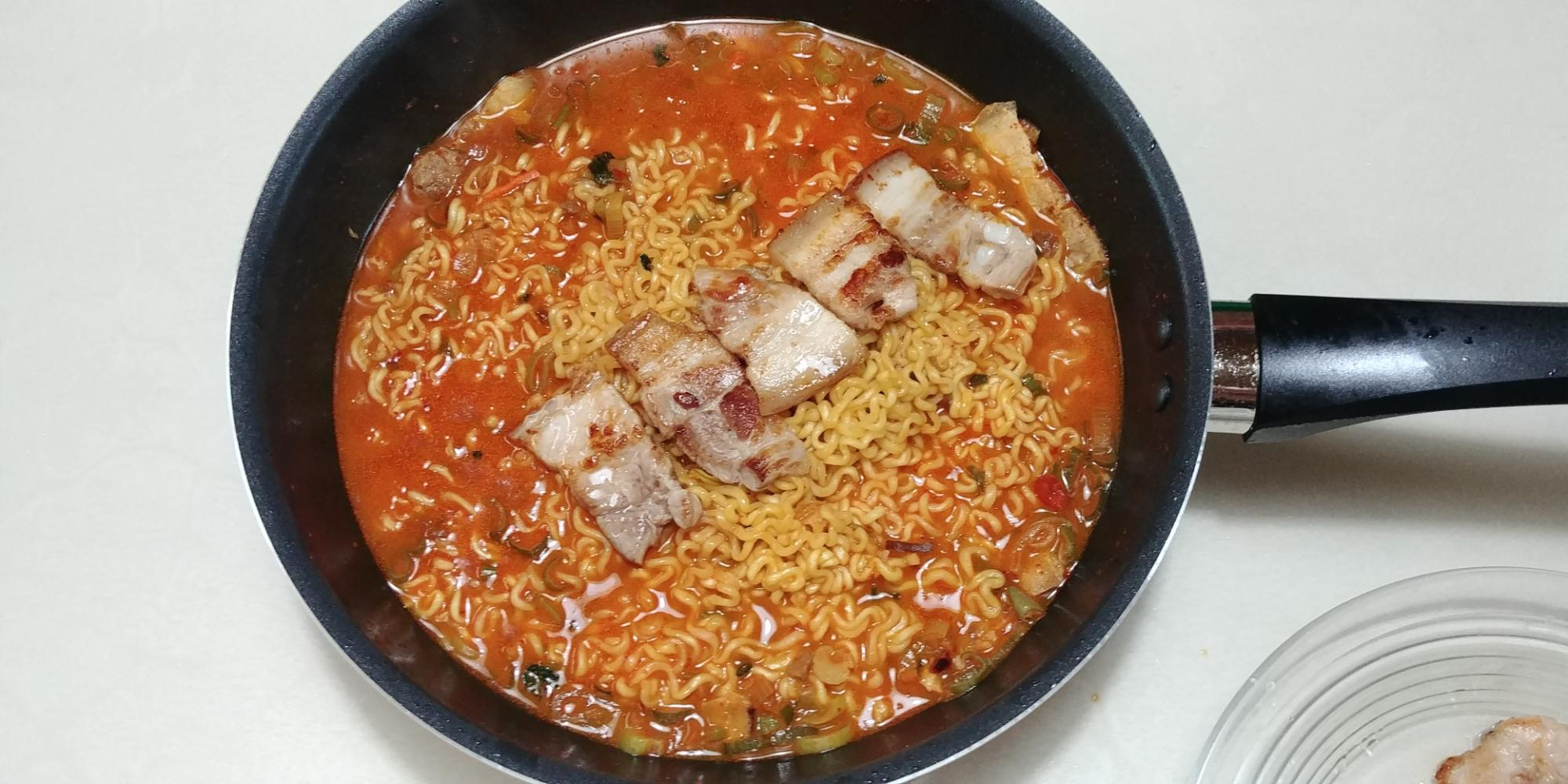 6. 맛있게 끓여진 삼겹살 파기름 라면, 삼겹살 대파 라면에 삼겹살을 얹어줍니다.