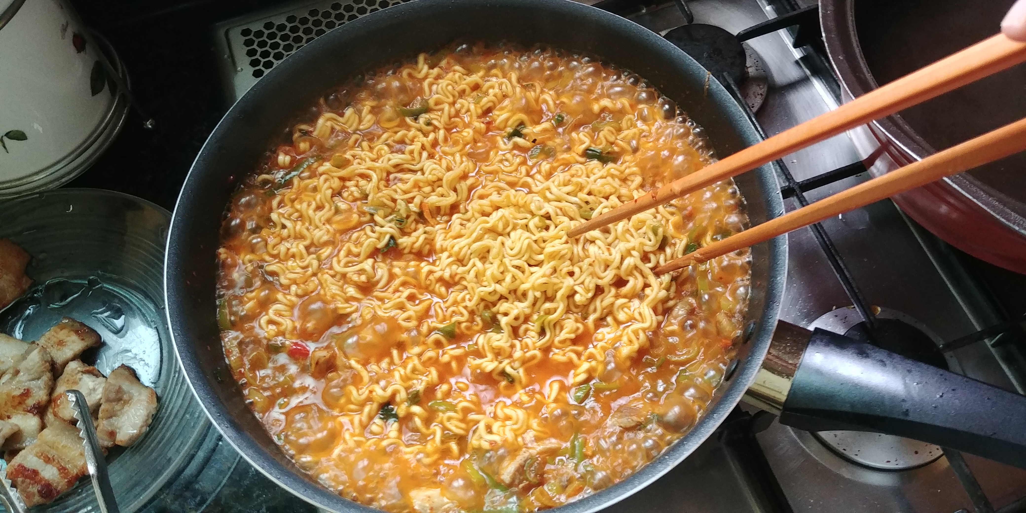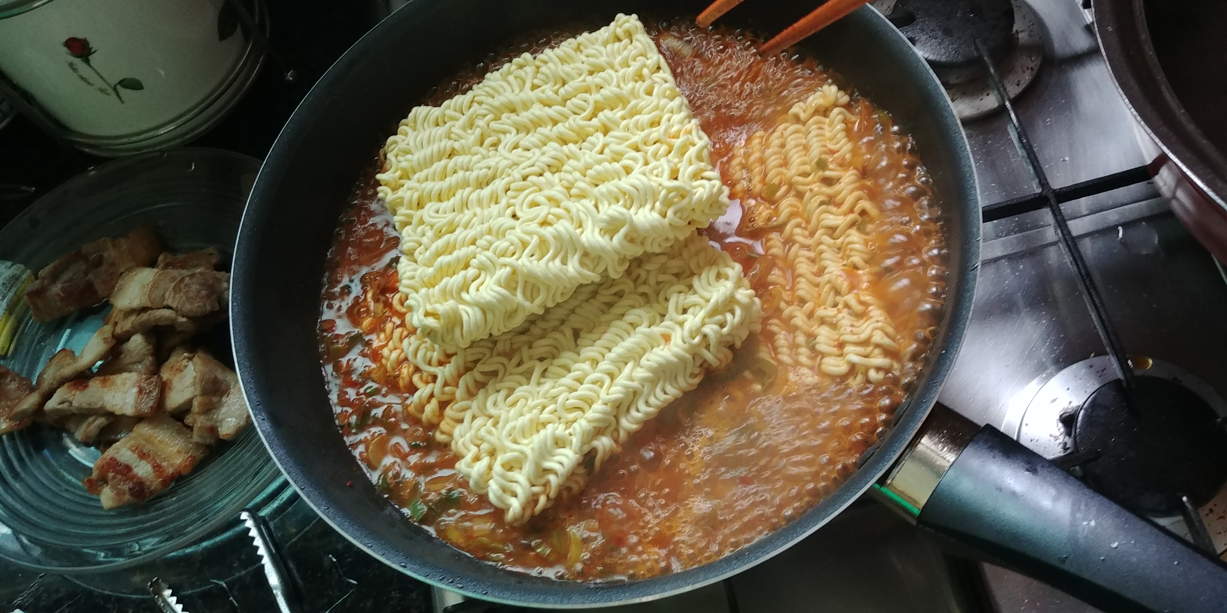 원래는 파기름에 라면스프와 고춧가루를 넣고 조금 더 볶아주기도 하지만, 위에서 언급했듯이 스프와 고춧가루가 타버릴 수 있기 때문에 저는 거의 바로 뜨거운 물을 넣어줬습니다. 이제는 일반적인 라면 끓이는 법과 똑같습니다. 면을 넣어주시고 익혀주시면 됩니다.