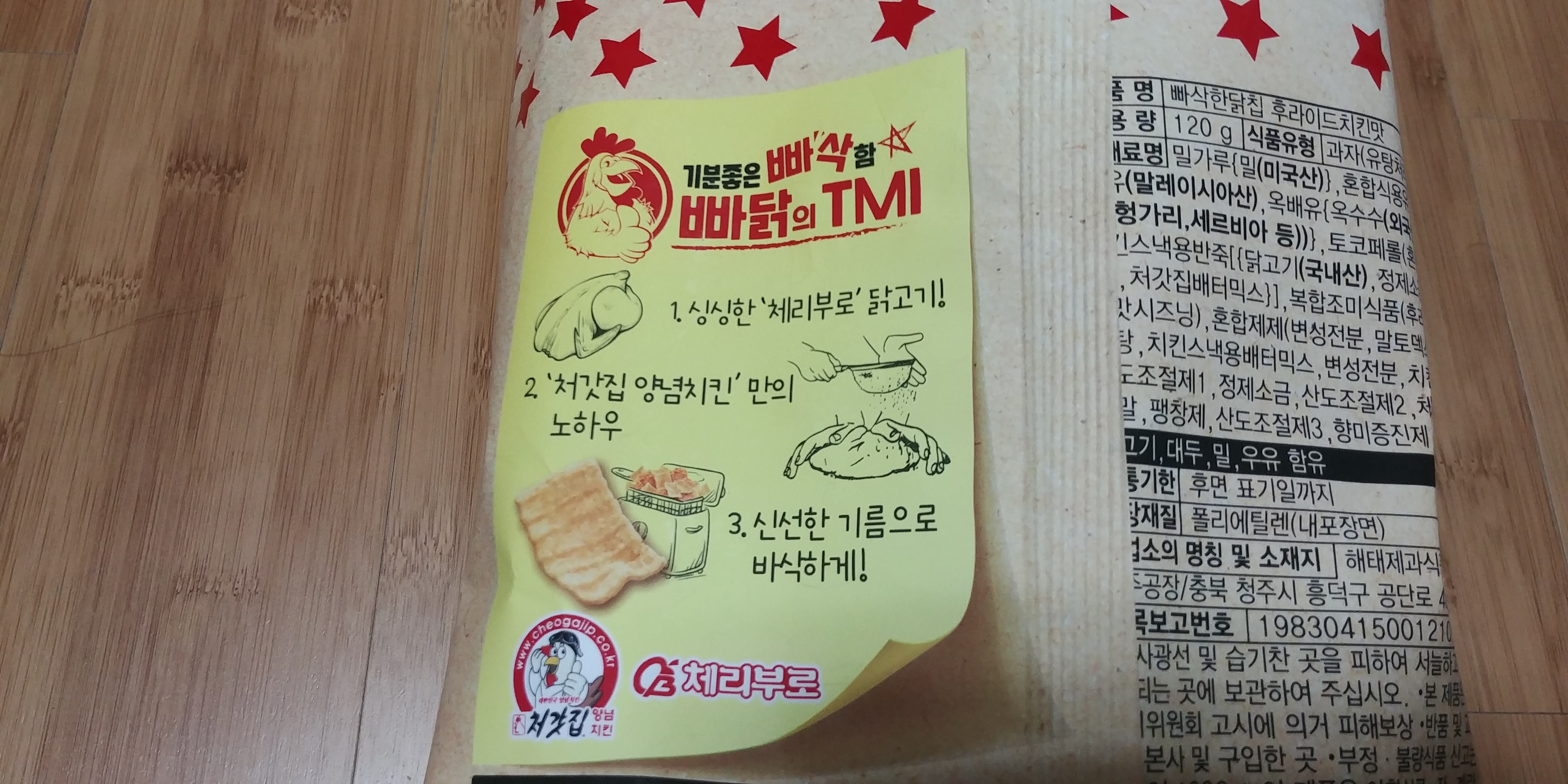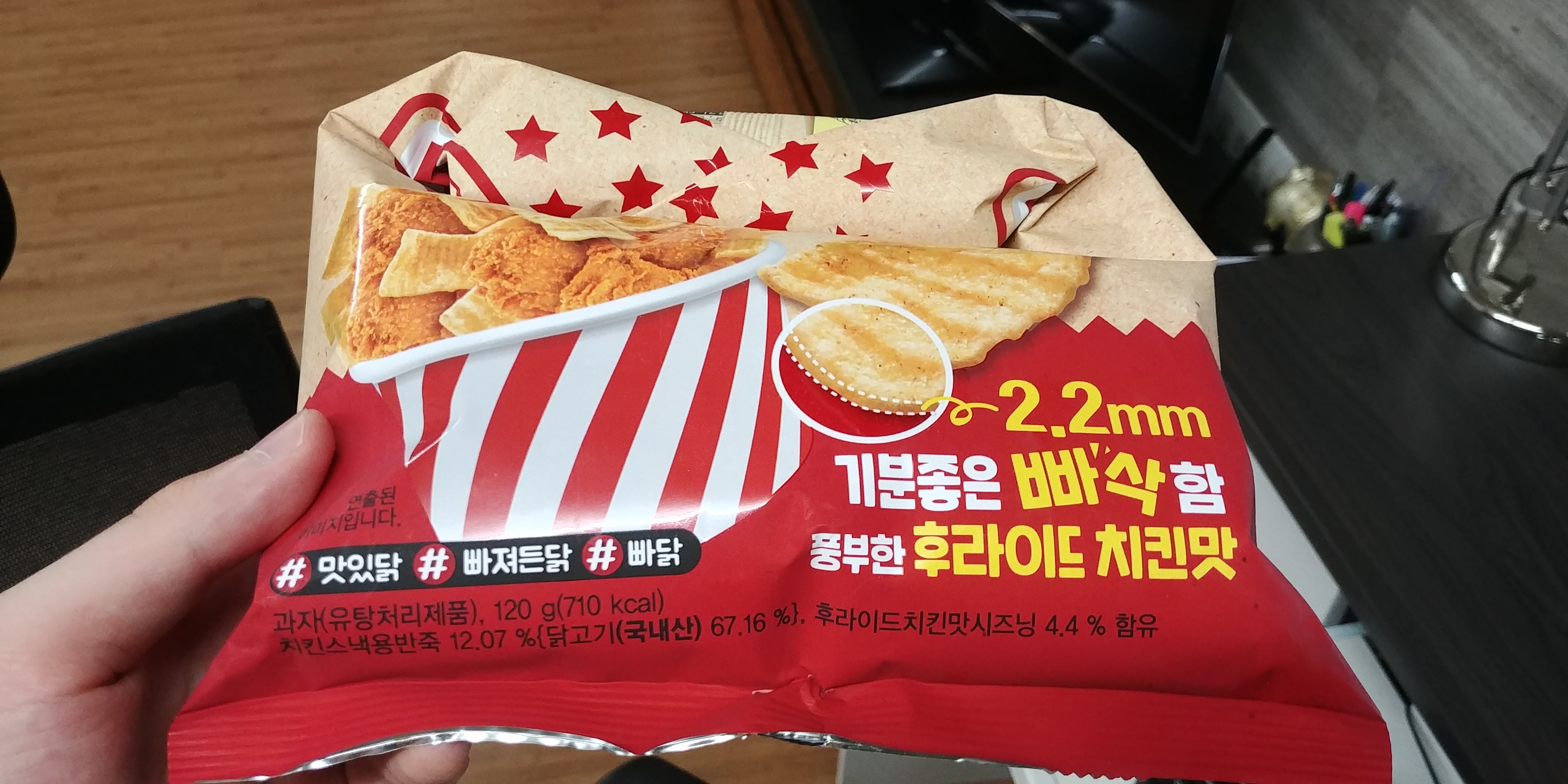 맨 위의 사진에는 과자 봉지의 상반신만 나오기 때문에 하반신을 새롭게 찍어봤습니다. 의외로 하반신에 좋은 정보들이 적혀있기 때문에 굳이 안찍어도 되지만 한 번 찍어봤습니다. "기분 좋은 빠삭함", "풍부한 후라이드 치킨 맛"이라는 문구가 눈에 들어옵니다.