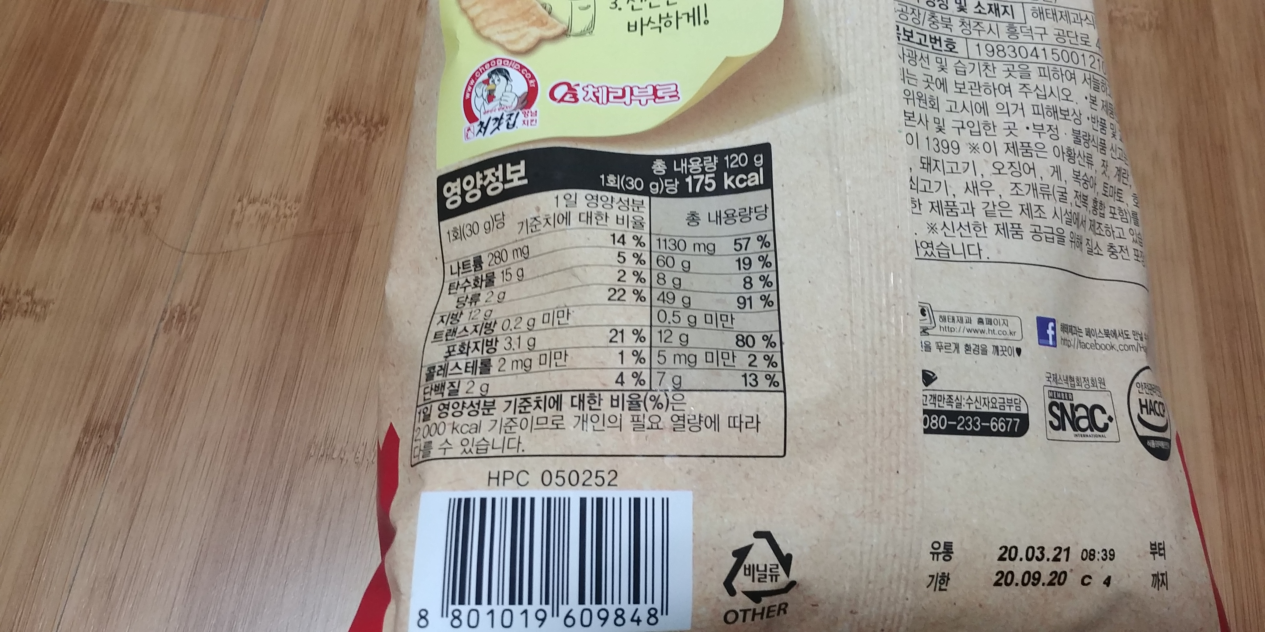 다음으로는 영양정보를 살펴보겠습니다. 역시 닭고기로 만든 과자라 그런지 지방과 포화지방이 많이 들어있는 것 같지만, 사실 닭이 들어가서 그런게 아니라 원래 과자는 지방과 포화지방이 엄청나게 많이 들어있습니다. 게다가 닭고기를 근본으로 한 과자가 아니라 치킨을 근본으로 한 과자기때문에 지방과 포화지방은 두 배가 된 듯싶습니다.