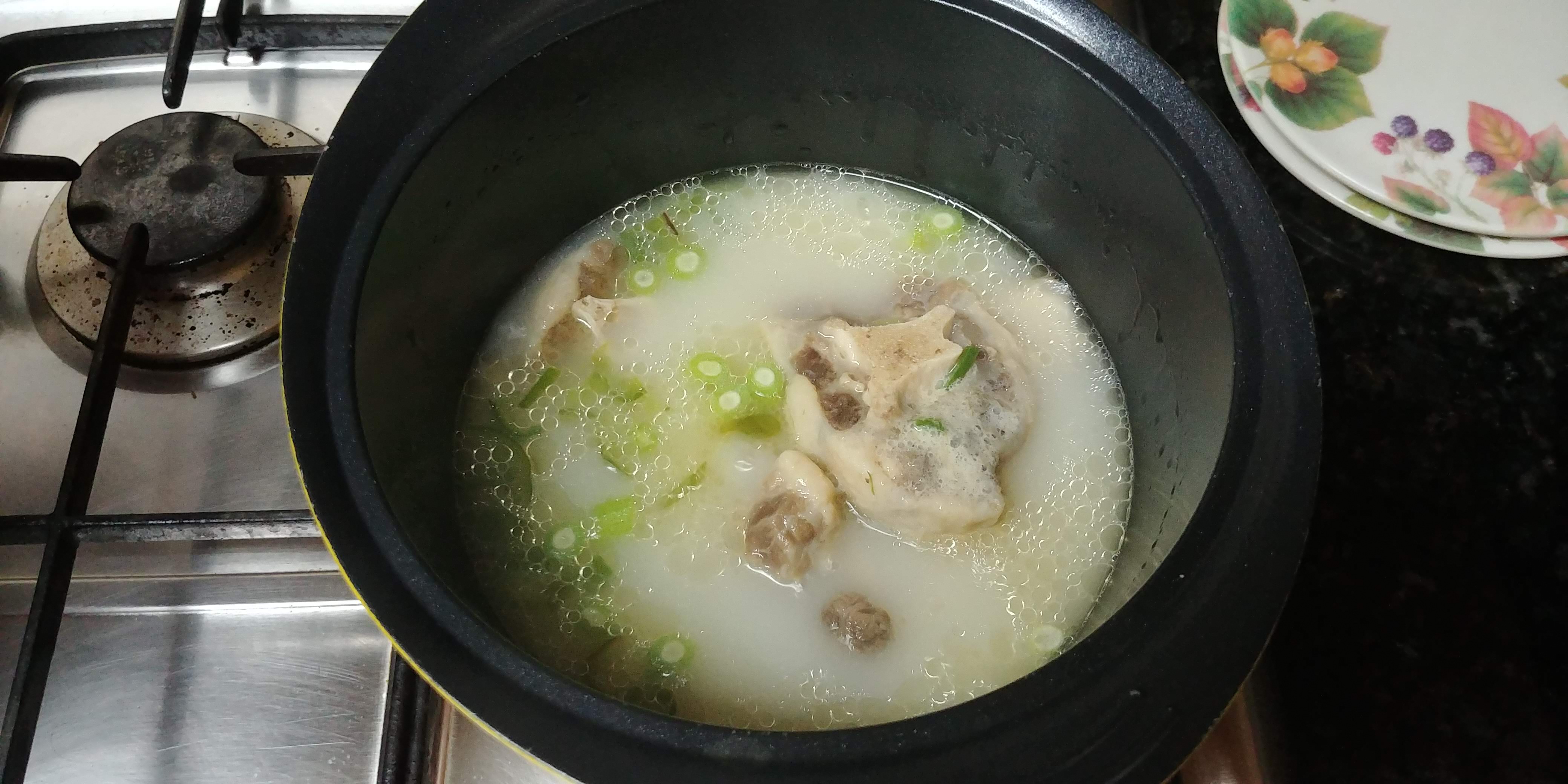 원래는 대파를 넣었어야 하는데 대파가 다 떨어져서 다진 청양고추와 마늘잎을 넣어봤습니다. 차가웠던 꼬리곰탕에 초록색 채소를 넣고 끓이니 뭉쳐있던 기름도 풀어지고 확실히 먹음직스럽게 변했습니다.