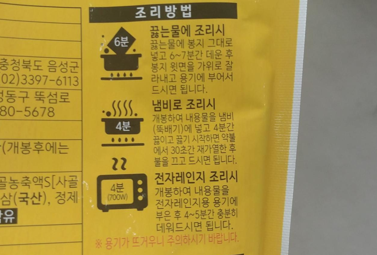 다음으로는 조리방법을 살펴보도록 하겠습니다. 총 세 가지의 조리법이 있습니다. 제품을 뜯지 않고 통채로 중탕하듯이 물에 끓이는 방법, 제품을 뜯고 내용물을 냄비에 부워서 끓이는 방법, 마지막으로 제품을 뜯고 용기에 담아서 전자레인지에 조리하는 방법입니다. 저는 두 번째 방법인 제품을 뜯어서 냄비에 부은 후 끓이는 것을 선택했습니다.