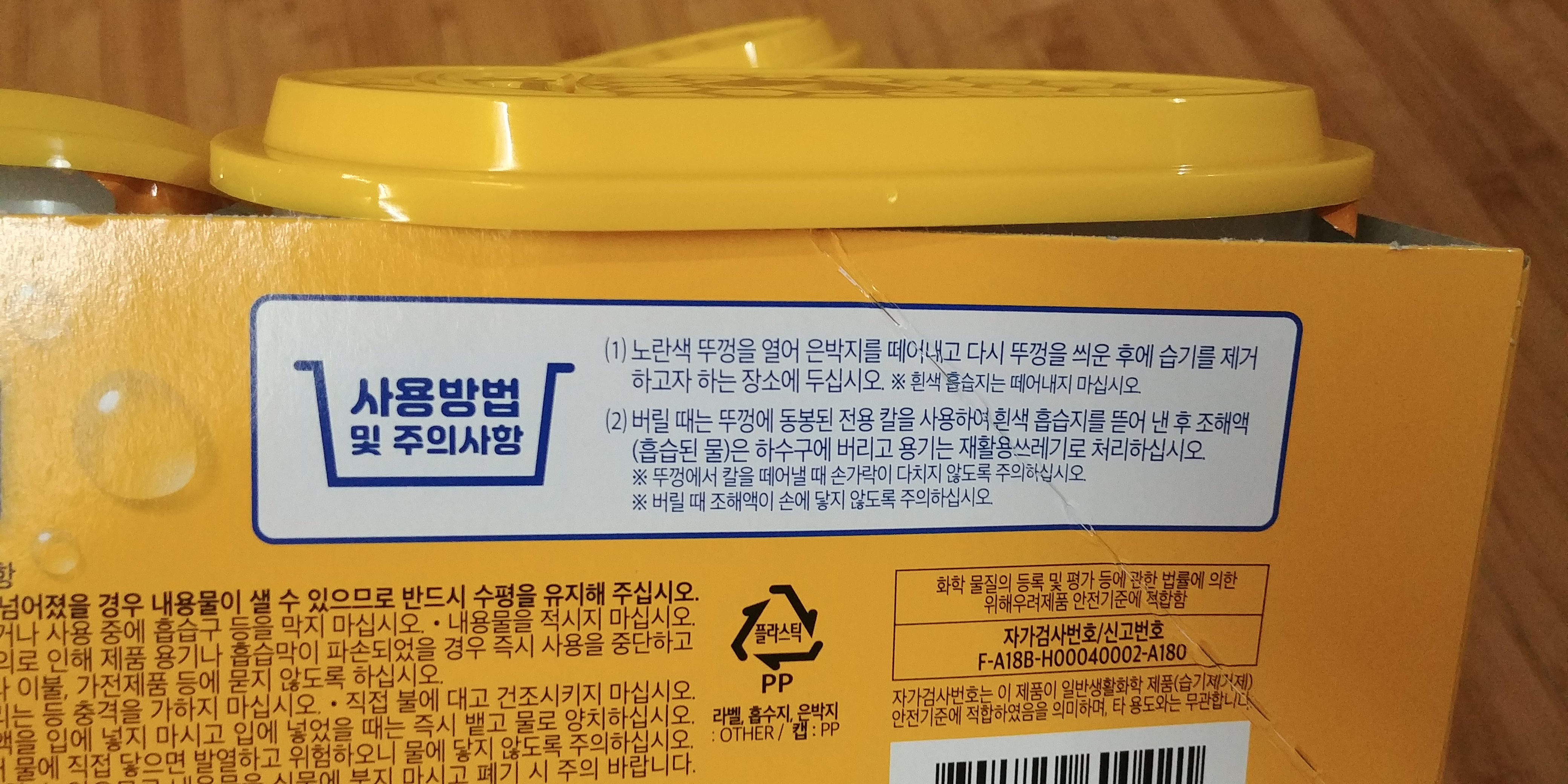 그리고 버릴 때는 뚜껑에 동봉된 전용 칼을 사용하여 흰색 흡습지를 뜯어 낸 후 조해액(흡습된 물)은 하수구에 버리고 용기는 재활용 쓰레기로 처리하라고 합니다. 저 칼의 용도를 여기서 확인할 수 있습니다.
