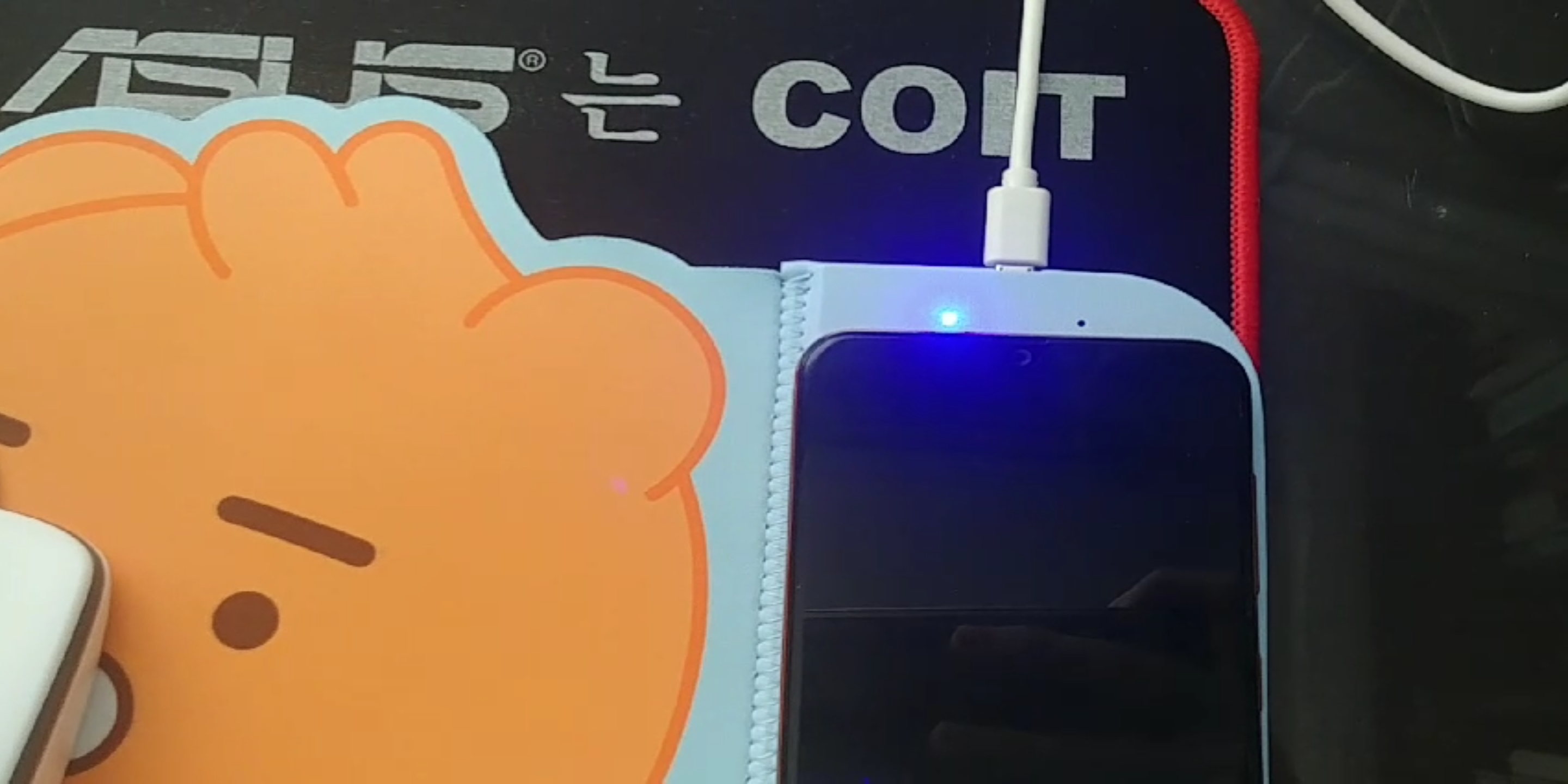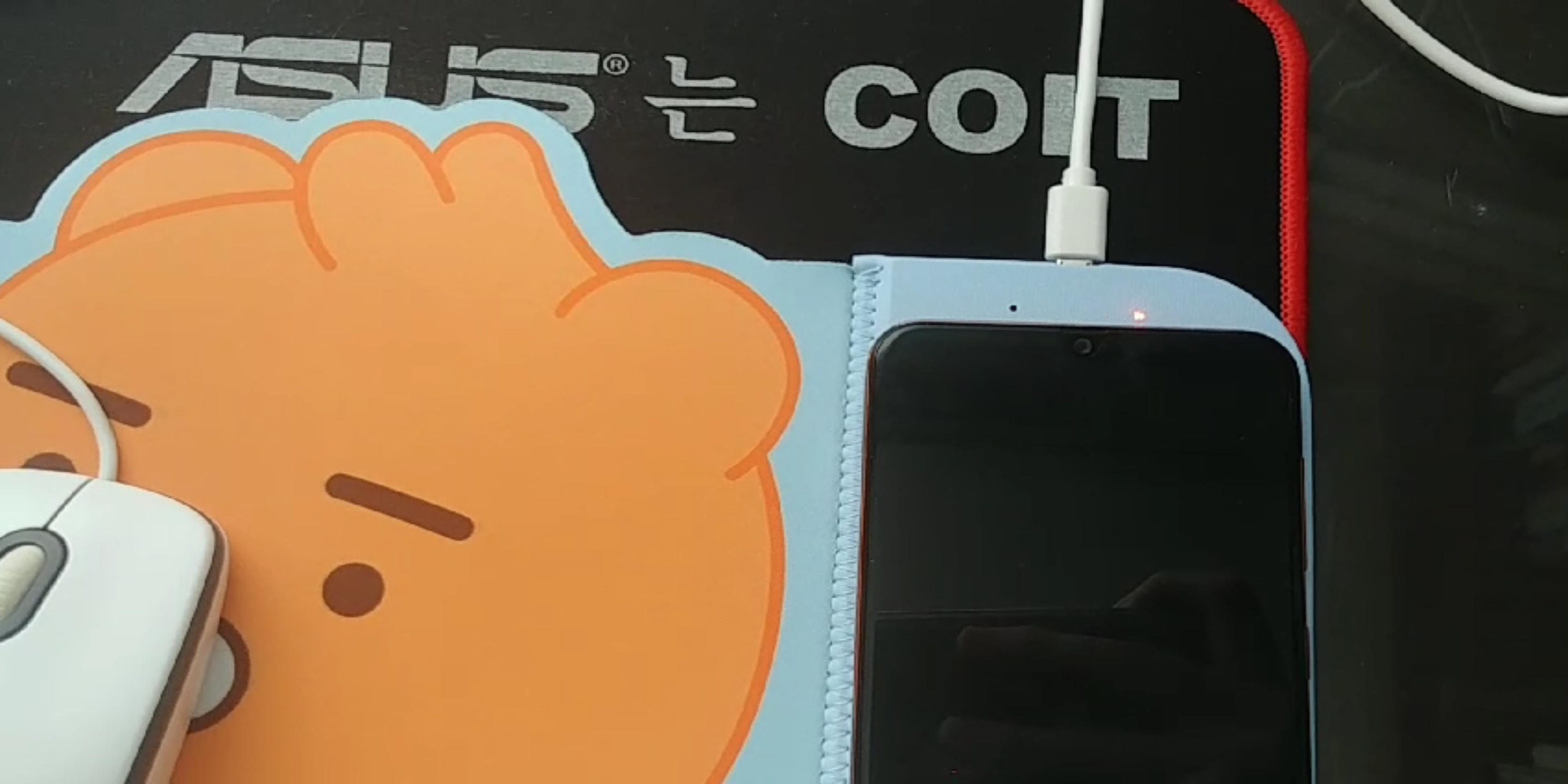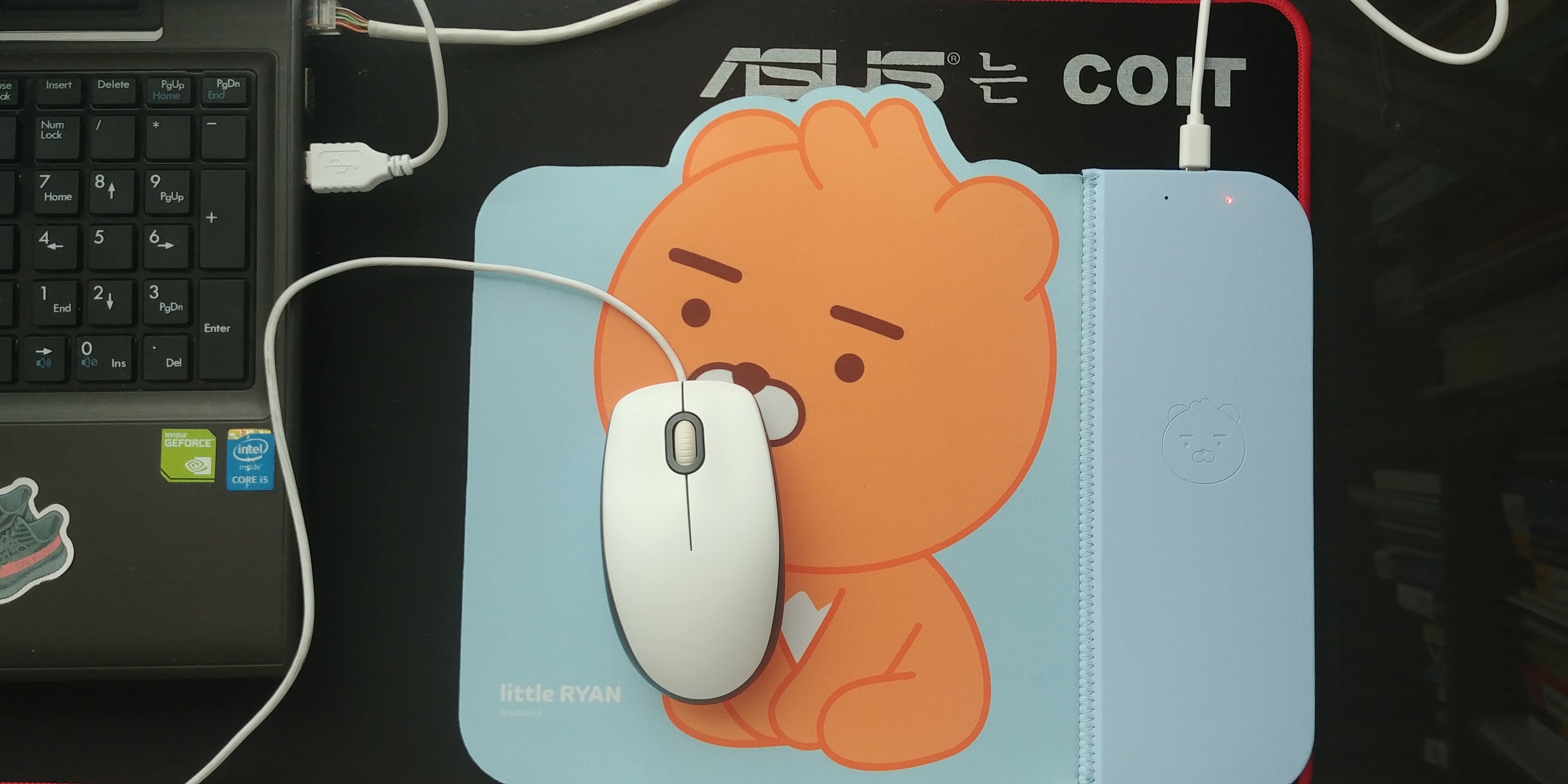케이블을 연결하는데 열 받긴 했지만, 그래도 막상 저렇게 놓고 보니 열 받았던 게 사라지는 것 같습니다. 노트북 주변의 환경과 상당히 잘 어울리는 것 같습니다. 사무실에서 카카오 리틀 프렌즈 무선충전 마우스패드를 쓰면 관심을 많이 받을 것 같습니다.