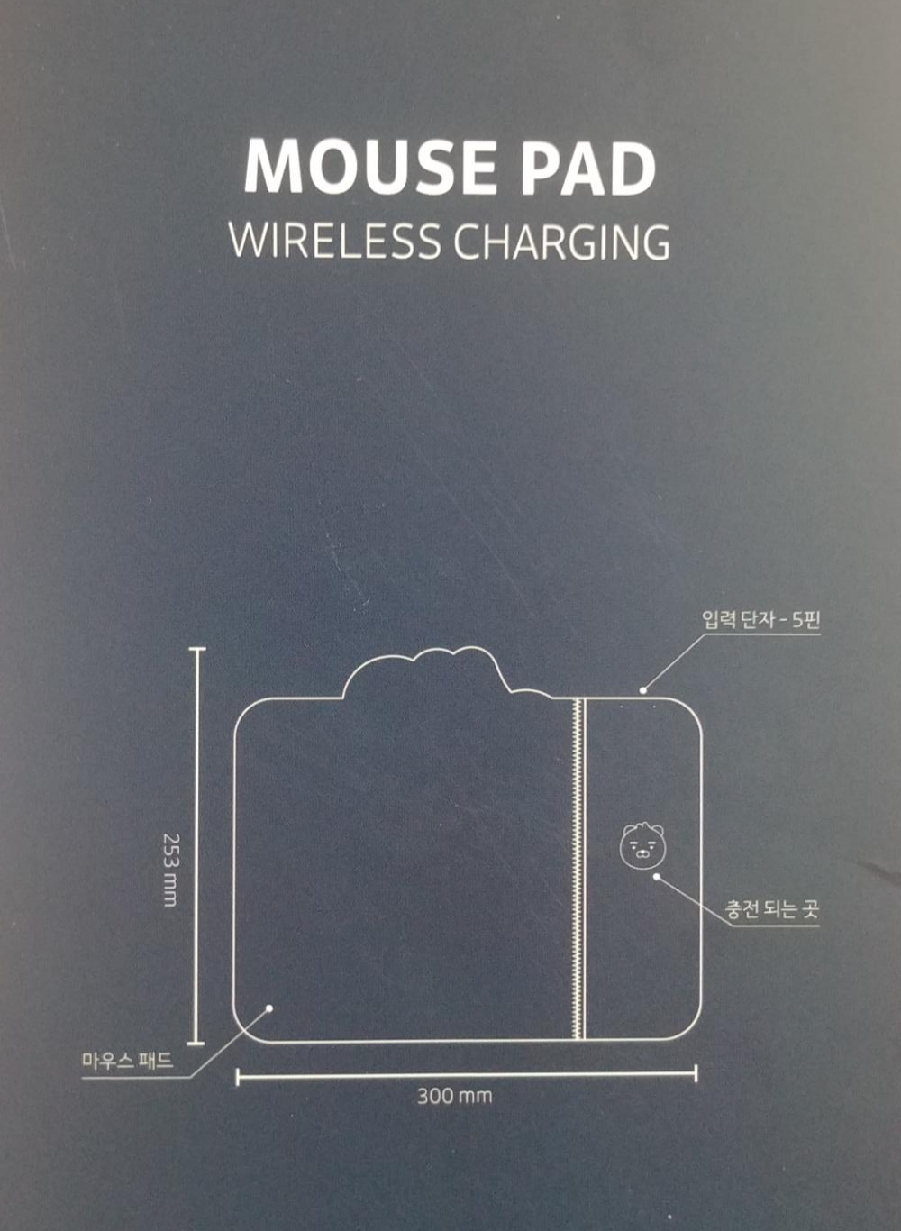 먼저 제품 규격 및 구조입니다. 제품 전체 면적의 왼쪽 4분의 3 정도가 마우스패드이고, 나머지 오른쪽이 스마트폰 무선충전 패드로 이루어져 있습니다. 크기는 가로 300mm, 세로 253mm인데, 대충 A4용지 크기랑 비슷하다고 보시면 됩니다.