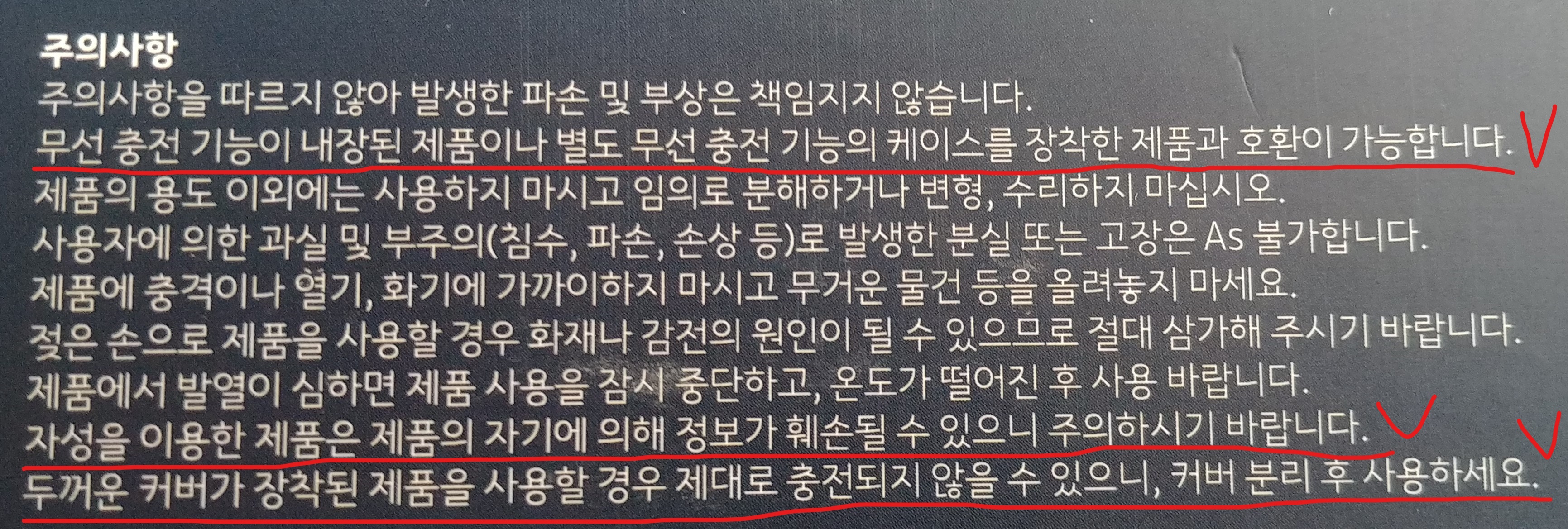 다음으로는 주의사항입니다. 얼티밋 고속 무선충전 패드에는 나와있지 않았던 부분이 조금 있는 것 같습니다. 먼저, 첫 번째 빨간 줄을 보시면, 모든 스마트폰이 이 무선충전 패드와 호환되지 않는다는 것을 나타내고 있습니다. (대표적으로 밑에서 소개할 LG G6와 삼성 A50은 무선 충전이 안 되는 스마트폰/핸드폰입니다.) 사실 이게 가장 중요한 부분이고, 나머지 부분은 그냥 눈으로 읽어보시면 될 듯합니다. 혹시 얼티밋 고속 무선충전 패드는 어떻게 나와있길래 그런지 궁금하신 분들은 밑의 링크를 참고하시면 되겠습니다.