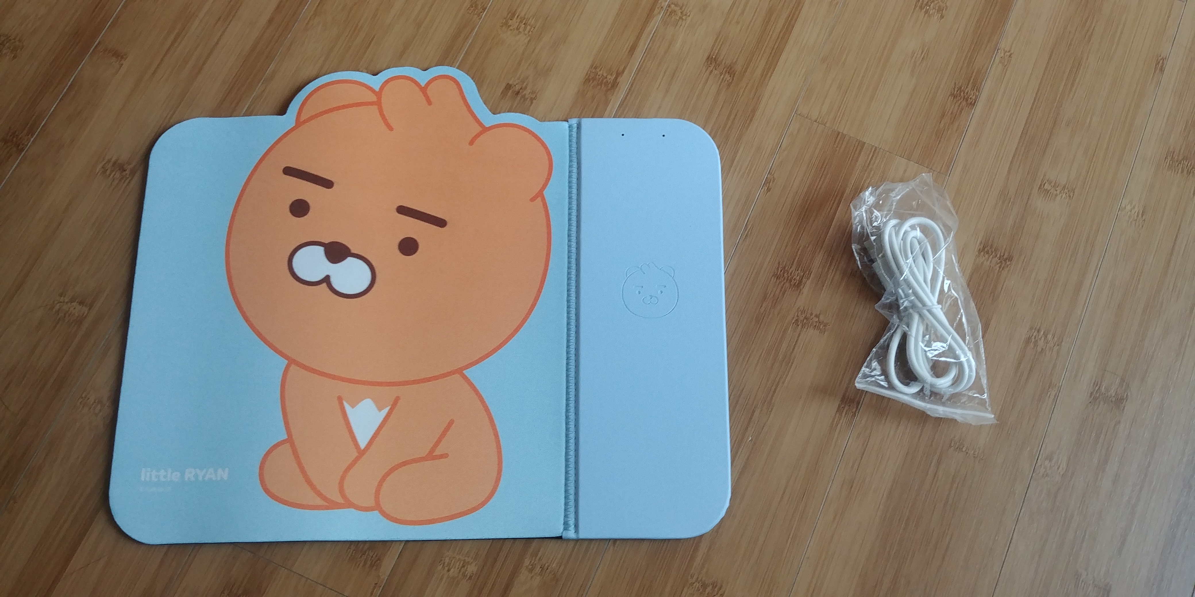 총 2개로 구성되어 있는데, 무선충전 마우스패드 및 5핀 USB 케이블이 동봉되어 있습니다. 그림보다 역시 실물이 훨씬 이쁘네요. 라이언이 상당히 귀여운 것 같습니다.