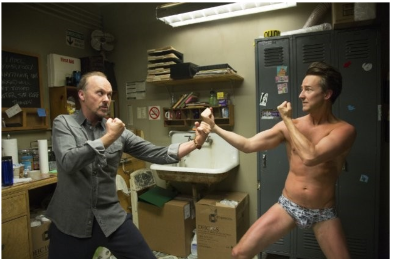 왼쪽에 셔츠를 입고 있는 사람이 버드맨 리건, 오른쪽에 속옷만 입은 사람이 (내가 생각하는 아이언맨) 마이크다.