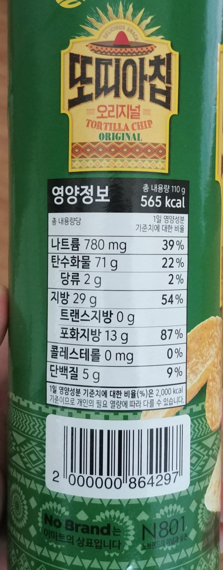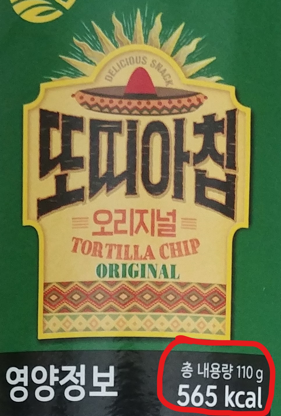 하지만 칼로리가 노브랜드 또띠아칩이 32kcal 더 높습니다. 별 차이 없습니다.