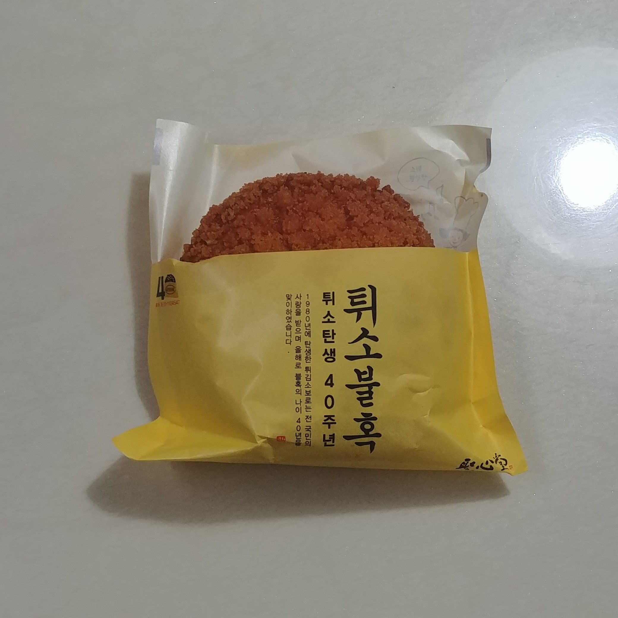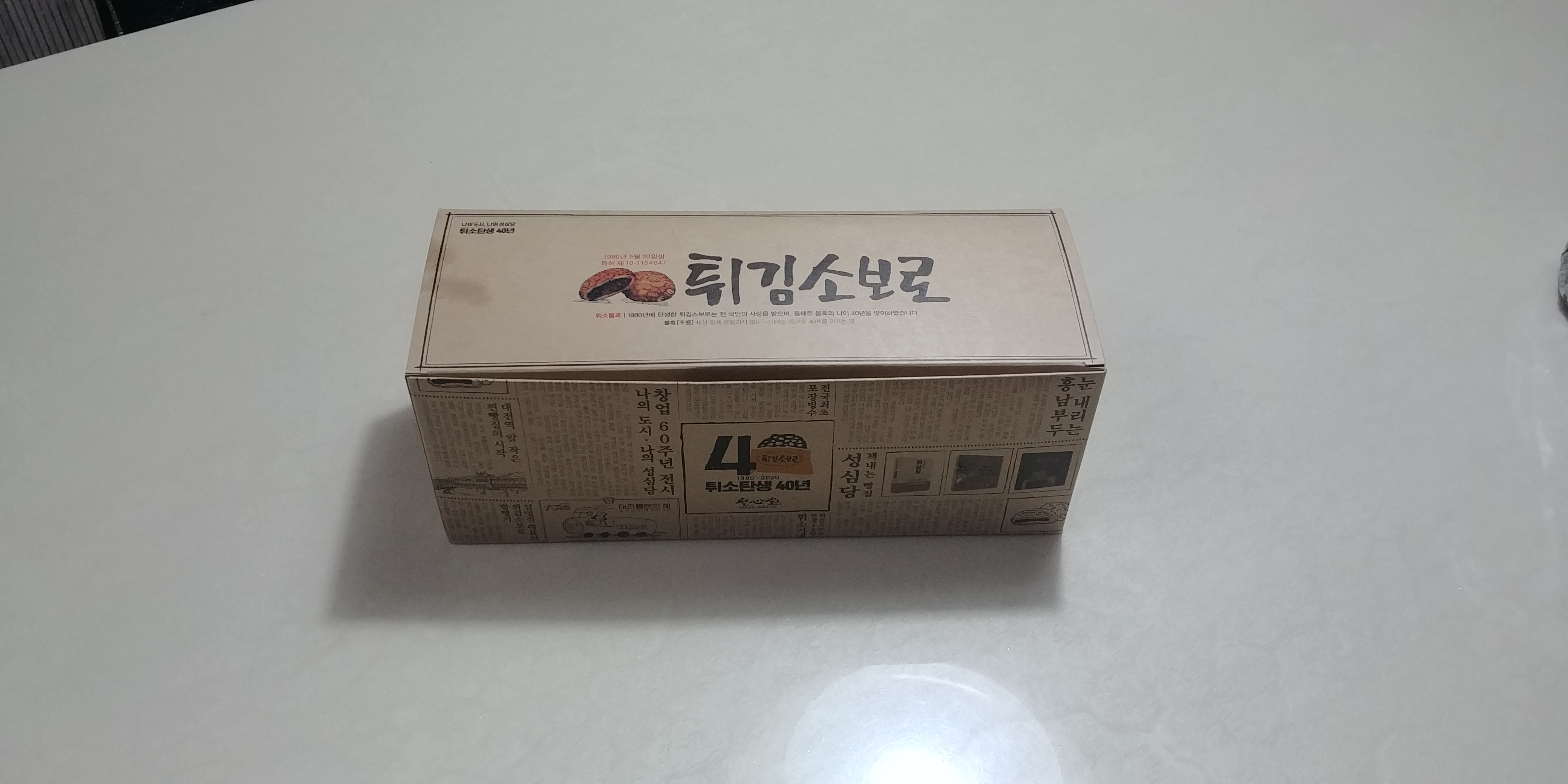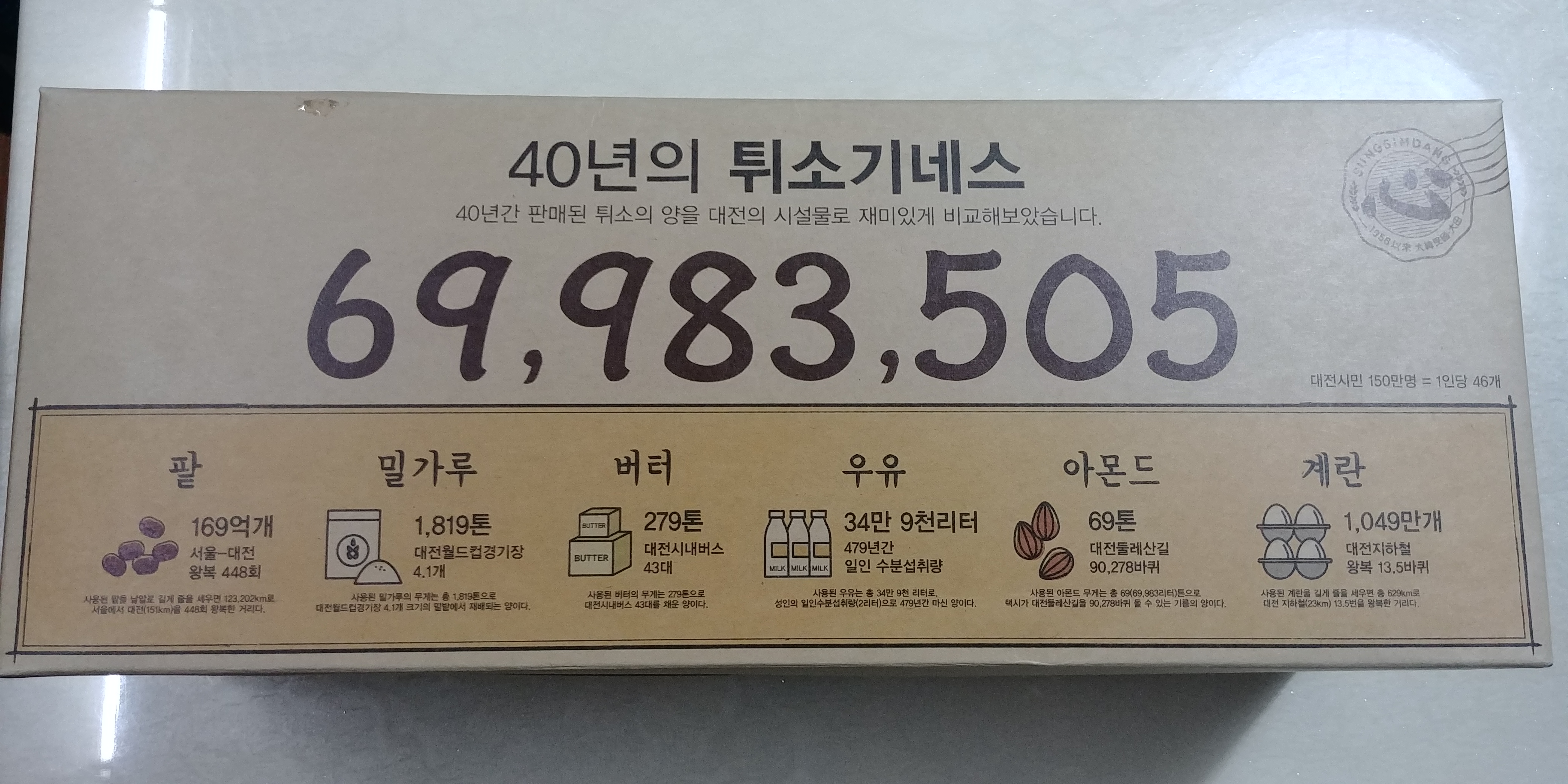 포장용 종이박스의 디자인이 생각보다 예쁜 것 같아서 한 번 찍어봤습니다. 40년간 69,983,505개가 판매되었다고 하는데, 튀소가 개당 1,500원이니 둘을 곱하면 104,975,257,500원이 나옵니다.