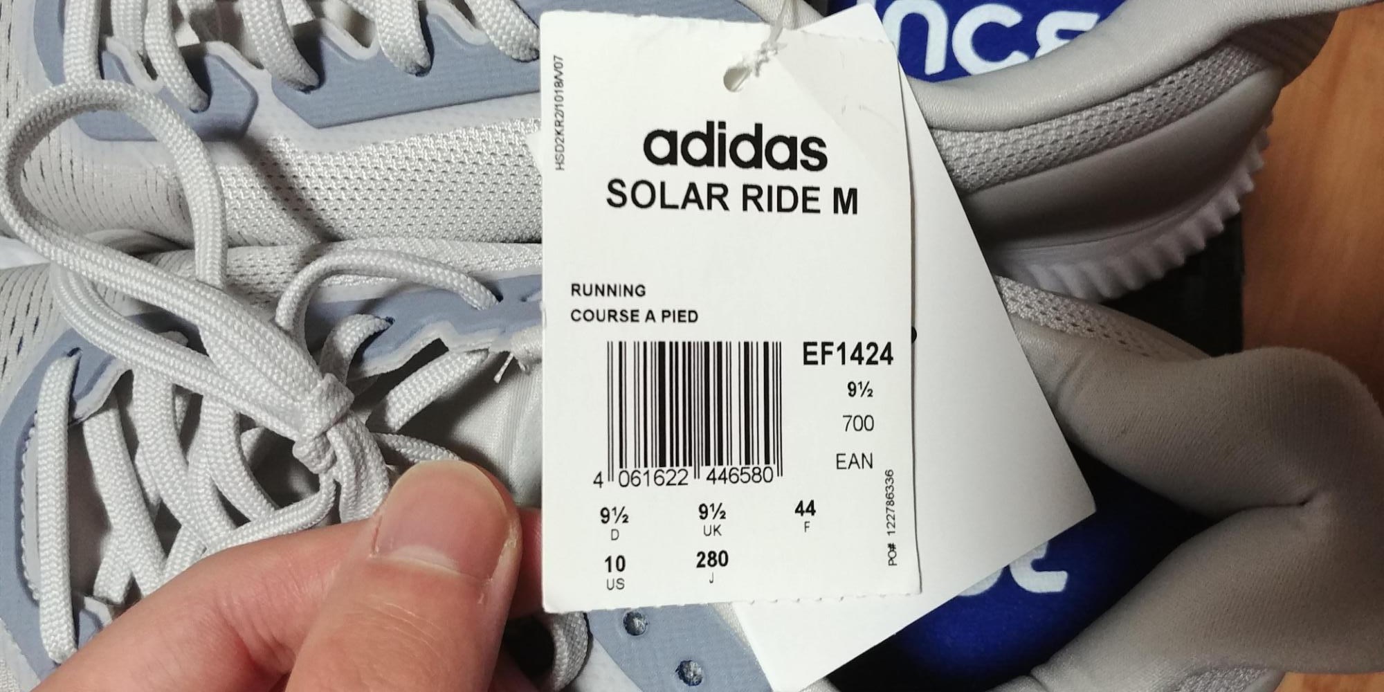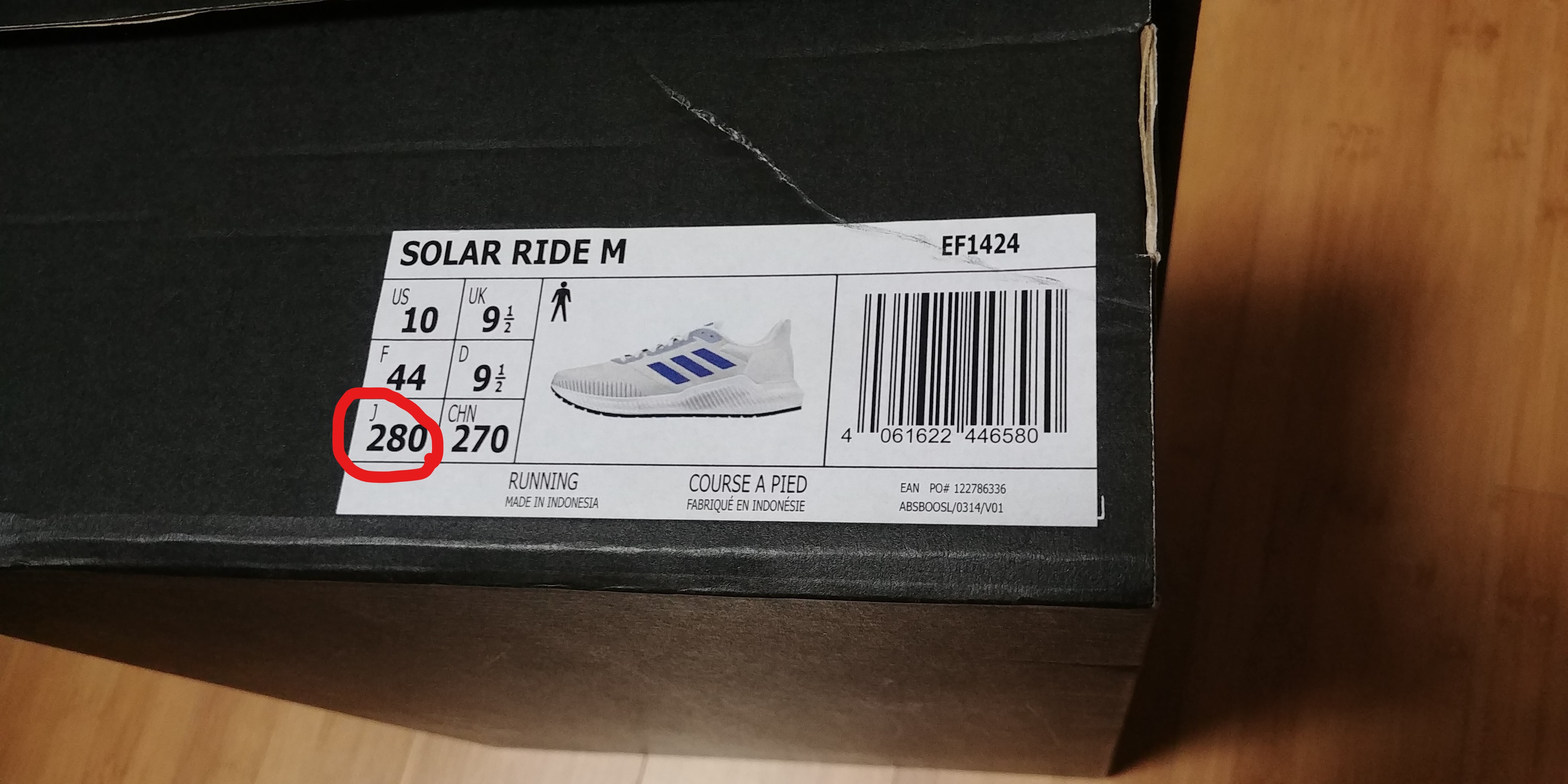 택에도 신발 사이즈가 나와있습니다. 이 신발의 정식 이름은 'adidas SOLAR RIDE M'이라는 것을 알 수 있습니다. 저 M은 남자용이라는 것 같습니다. 물론 100% 제 뇌피셜입니다.