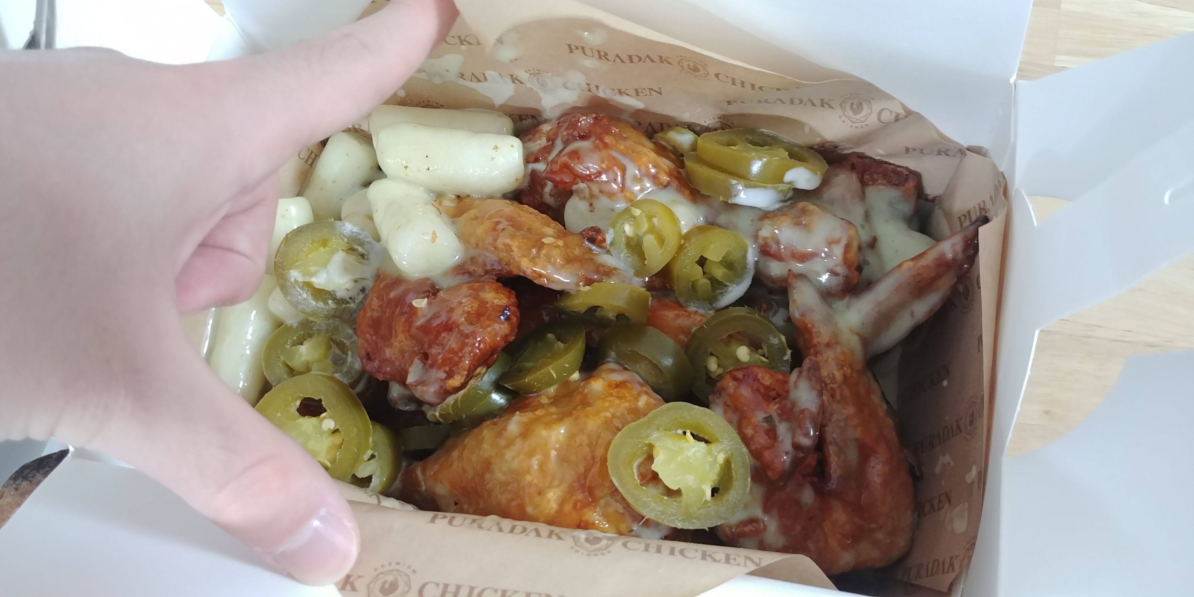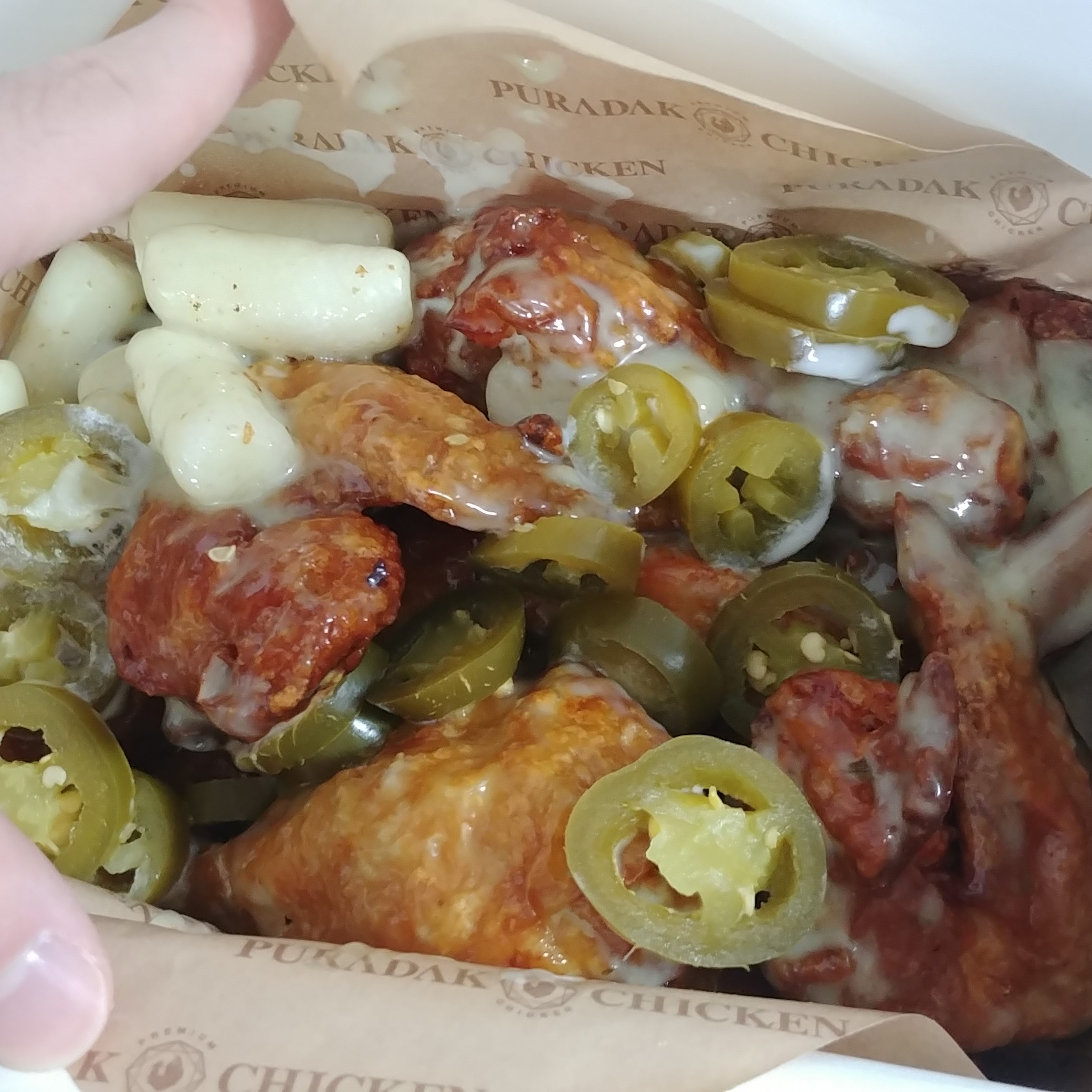 신기하게도 떡과 할라피뇨가 추가로 들어가 있습니다. 또, 고추마요 소스가 치킨에 골고루 발라져 있습니다. 혹시나 했지만, 역시나 위에서 말씀드린 별도로 포장된 고추마요 소스와 똑같은 맛이었습니다.