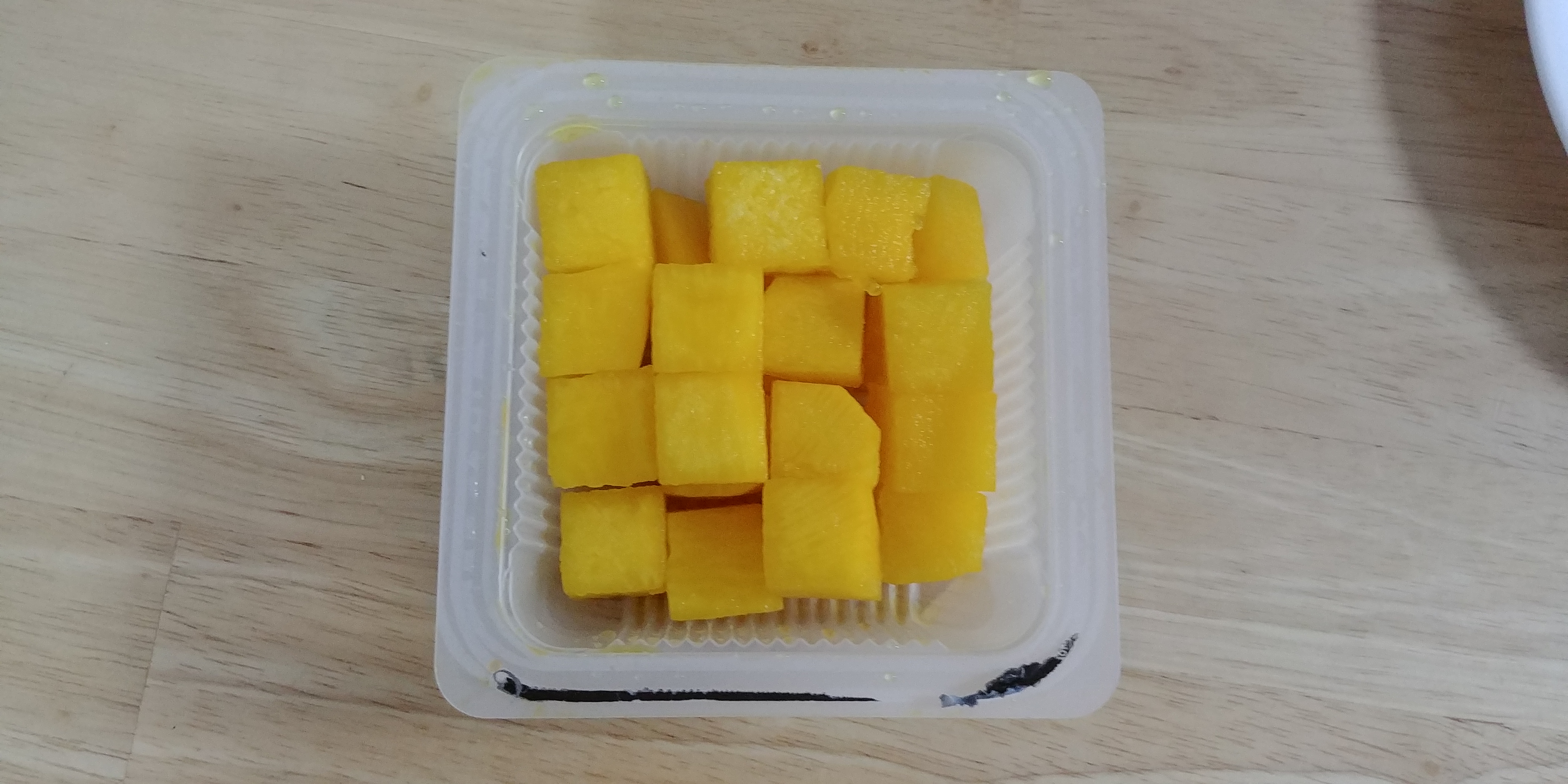 신기해서 한 번 찍어봤습니다. 김밥에 들어가는 단무지와 비슷하게 치자로 물을 들인 것 같습니다. 하지만 맛은 일반 치킨무와 똑같다고 보시면 됩니다.